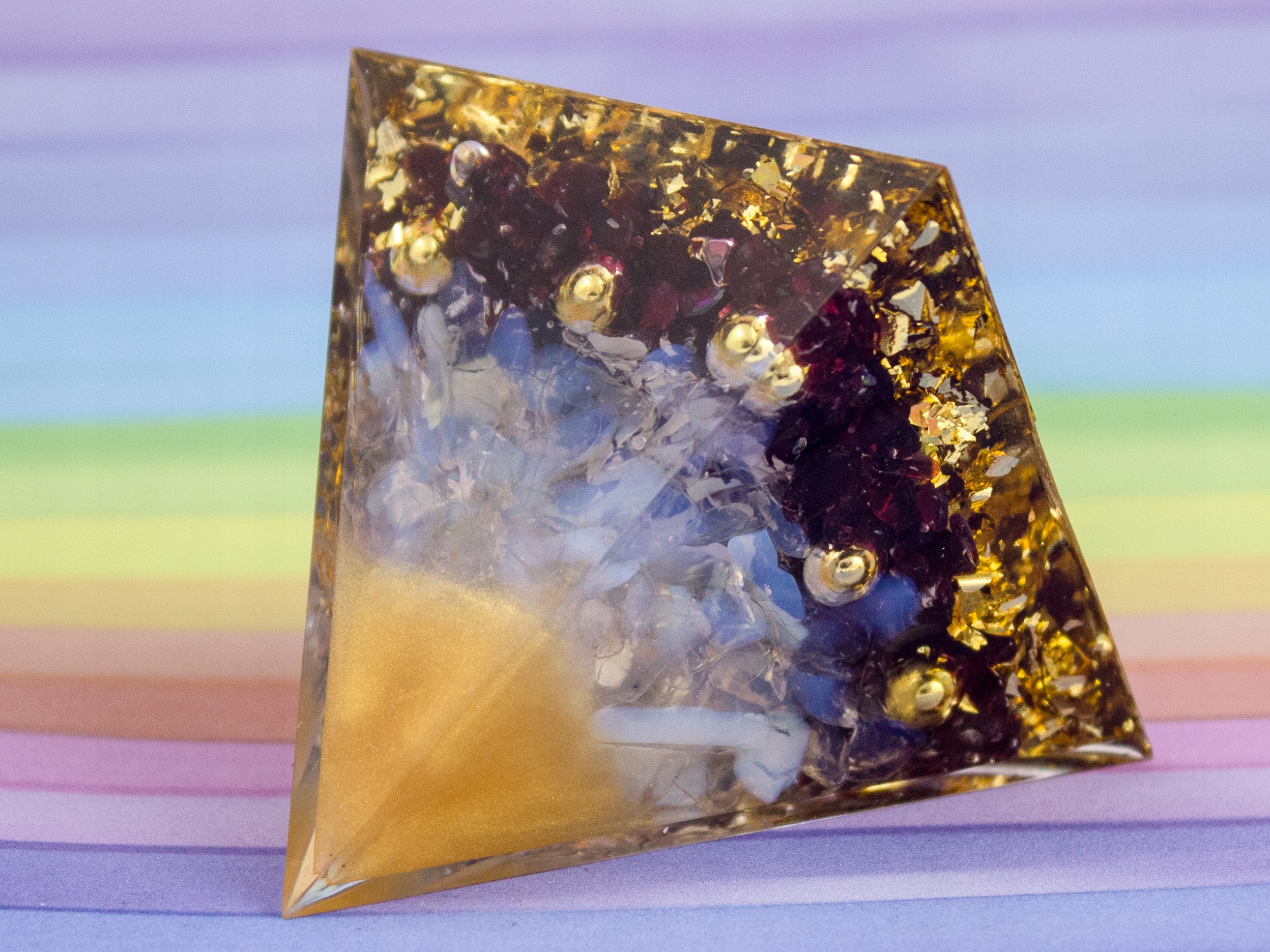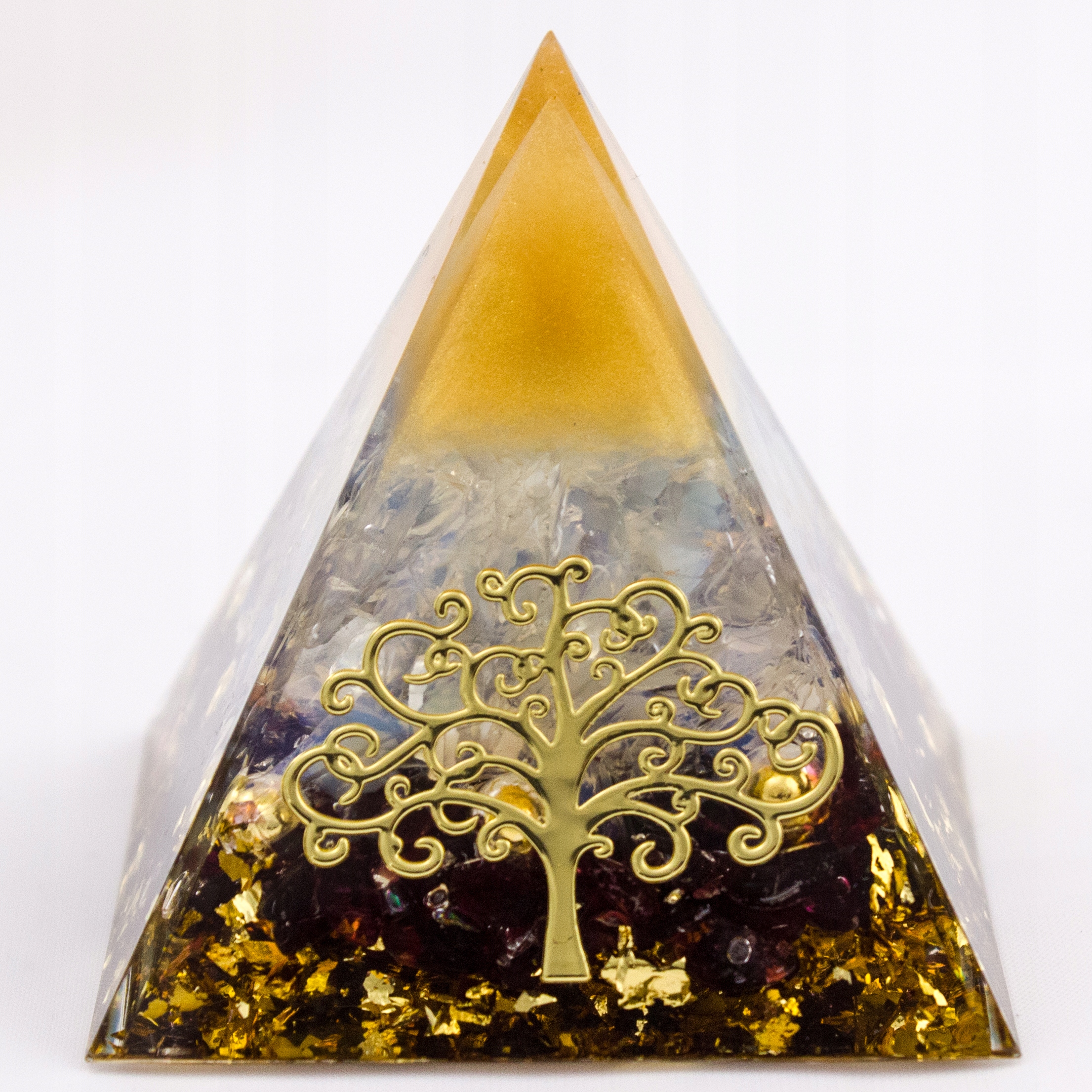 Цілющі ефекти, сила мінералів, дорогоцінний природний гранат і дерево життя - прекрасна прикраса - символ захисту!!! h2>Оргонітова піраміда з дорогоцінним мінералом гранатом, який чудово поєднується із золотою фольгою, кристалом і енергетичним шляхом - Деревом Життя - випромінює дивовижну чисту силу для покращення функціонування всіх чакр, а також має чудовий зовнішній вигляд і кольори.