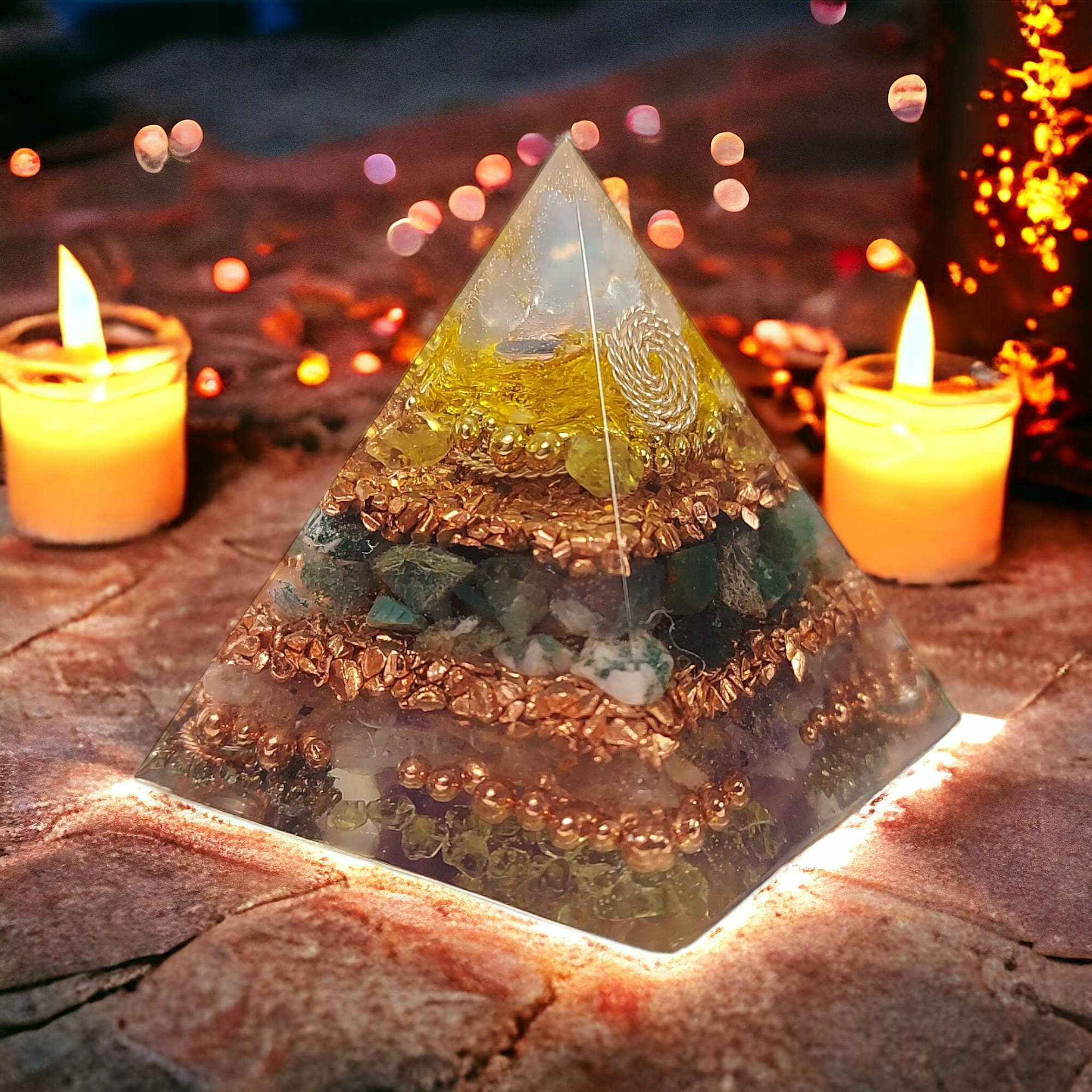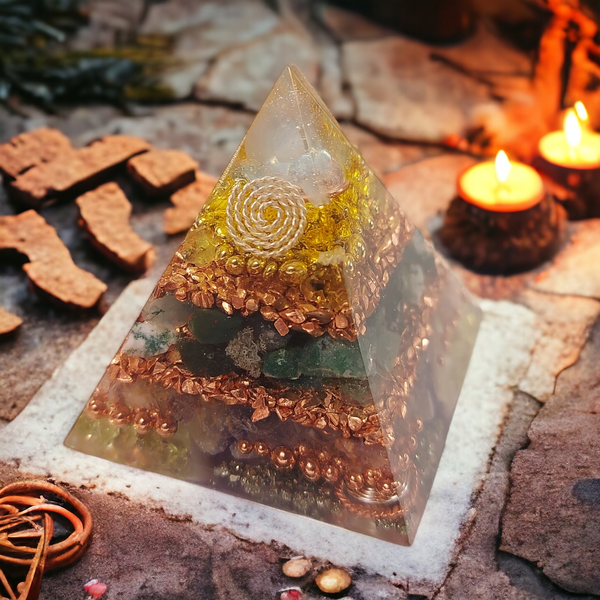 Оргоніт - Піраміда Успіху та Радості - Аквамарин Цитрин Олівін Агат Моховий Флюорит Пірит Аметист Селеніт