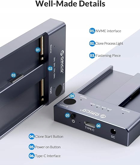 Цей клонер M.2 NVMe спеціально розроблено для M Key NVMe PCIe SSD (22110/2280/2260/2242). Підтримує читання та запис на 2 жорстких дисках M.2 NVMe одночасно. Сумісний із Windows/Mac/Linux, його можна використовувати для автономного клонування або для збільшення обсягу пам’яті шляхом підключення ПК, ноутбука, Smart TV, PS4, XBOX та інших пристроїв.