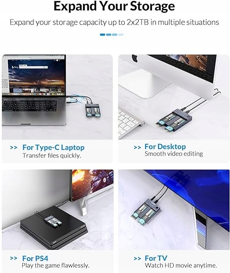 КЛОНАЛЬНА ДОКУВАННЯ OICO USB 3.2 Gen2 M.2 оснащена кабелем C до C та C до кабелю, що забезпечує більший вибір. Найшвидша швидкість передачі може досягти близько 1000 Мб/с у випадку з кабелем C до C та близько 500 Мб/с у випадку з кабелем C до А. в той же час, він підтримує протокол прискорення UASP, завдяки якому NVME SSDS діяти швидше і стабільно.