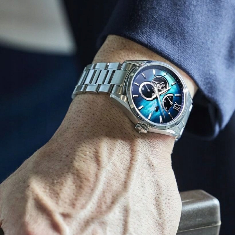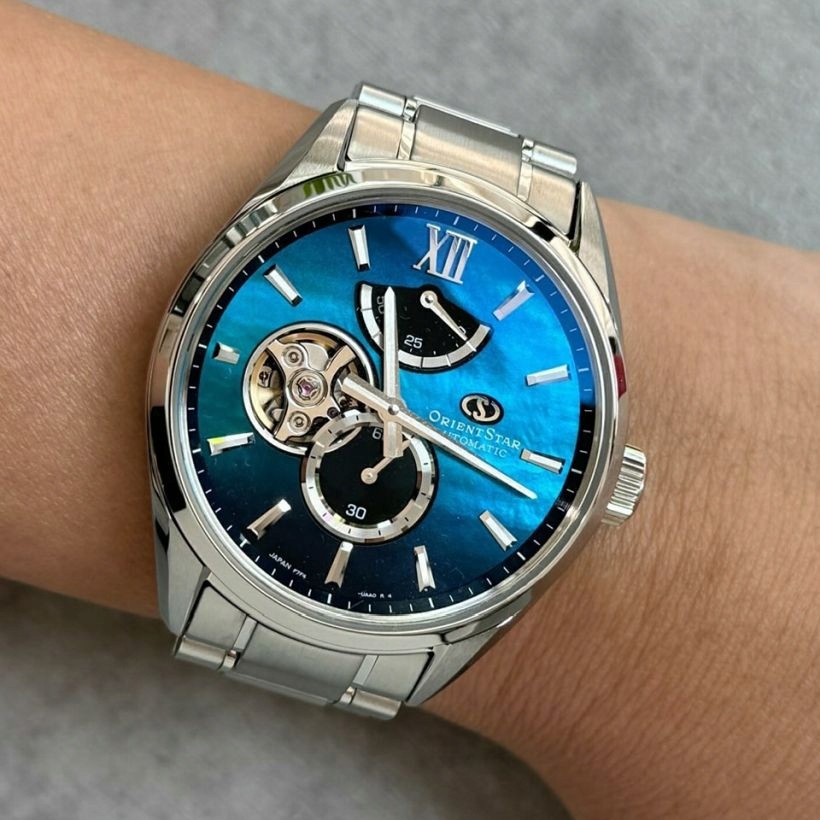 Orient Star RE-BY0004A00B радує гармонійним поєднанням класики та сучасності. Синій циферблат із ефектом сонячних променів і точними покажчиками забезпечує відмінну читаність, а полірована нержавіюча сталь із сріблястим покриттям підходить до сталевого браслета зі зручною застібкою з кнопками. Вага прибл. 140 г і тонкий дизайн дозволяють годиннику зручно триматися на зап’ясті, поєднуючись із елегантним і повсякденним стилем. Додатково привертає увагу індикатор запасу ходу на 12 годині та вікно Open Heart, що розкриває технічну тонкість механізму. Варто додати, що прозора кришка демонструє чудово оброблений механізм із женевськими смужками, що підтверджує високу якість та оригінальність годинника.