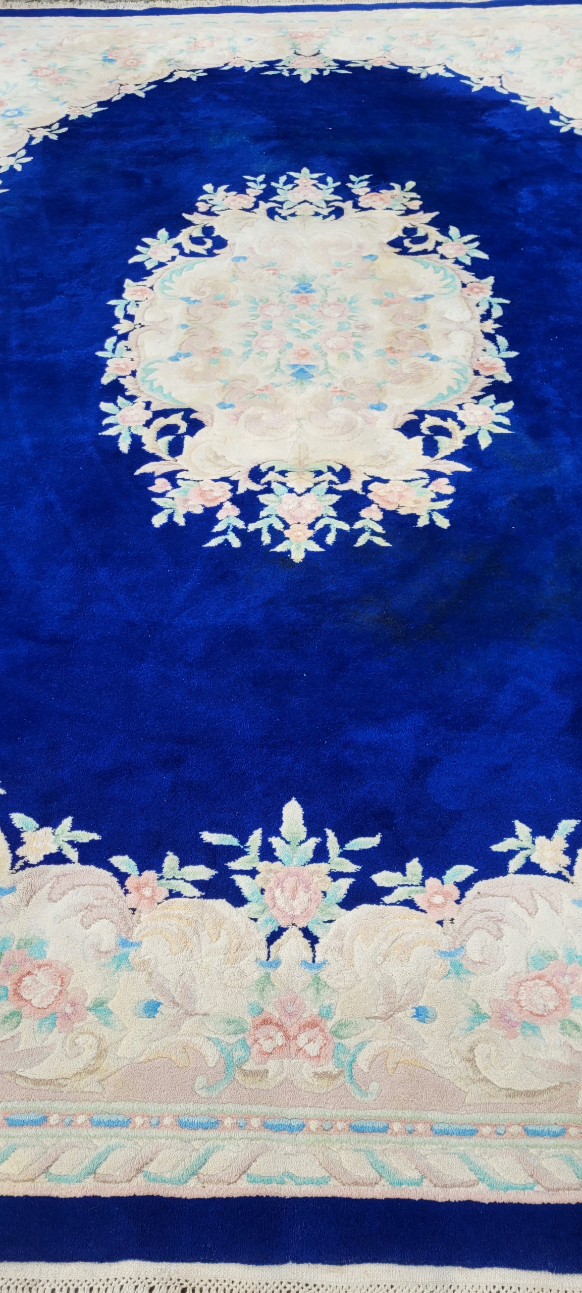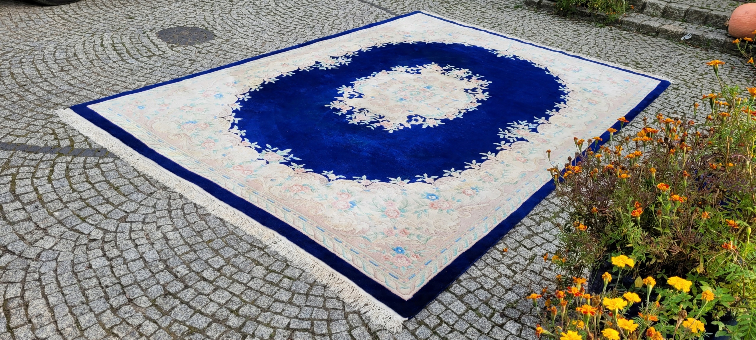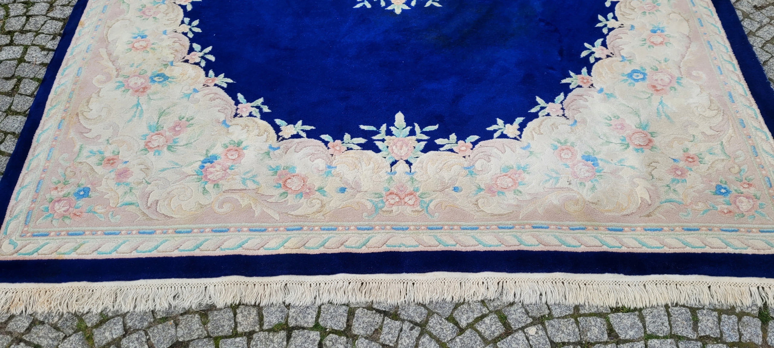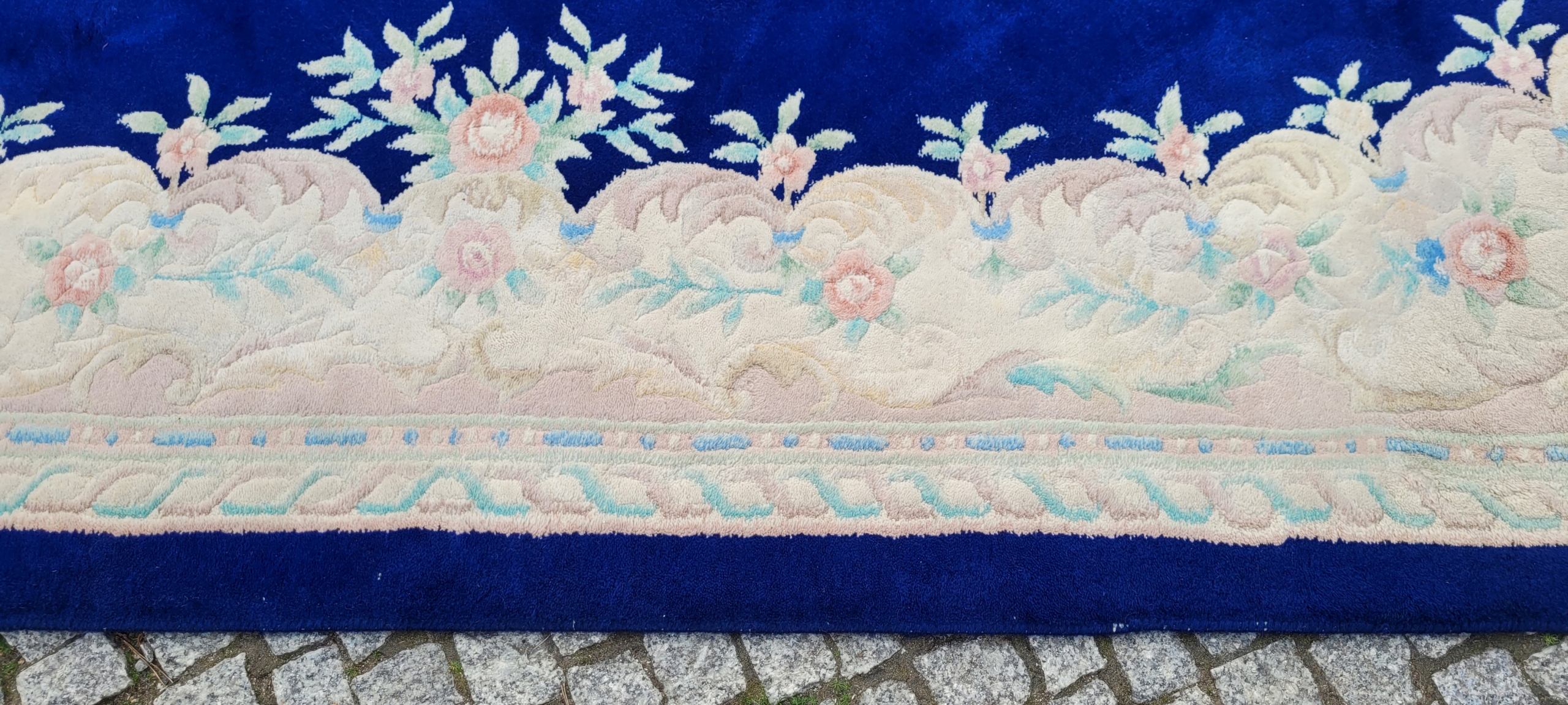 Чудовий китайський килим Aubusson. Виткана вручну з вовни найвищої якості. Надзвичайно масивний і важкий. Він характеризується компактним, блискучим флісом і красивими кольорами. Має характерні вирізи візерунка. Він у дуже хорошому стані, мінус видно на фотографіях.