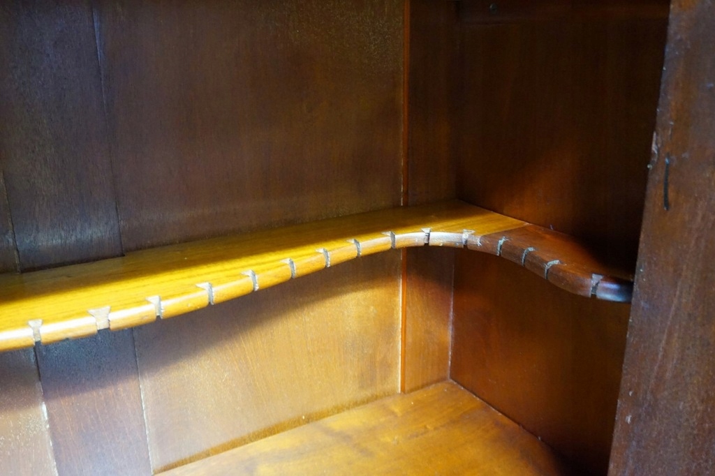 Всередині шафи є полички і невелика поличка з вирізами для склянок
