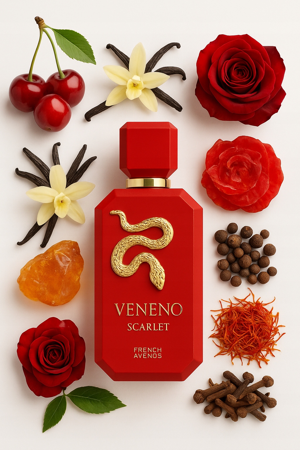 Veneno Scarlet - це ніч, тіло, близькість. Черешня і троянда, зігріті шафраном, створюють ауру чуттєвої розкоші, а ваніль і амбра змушують аромат «прилипати» до шкіри і залишатися довго після дотику. У ньому є гріх, є самовпевненість і є магнетизм.