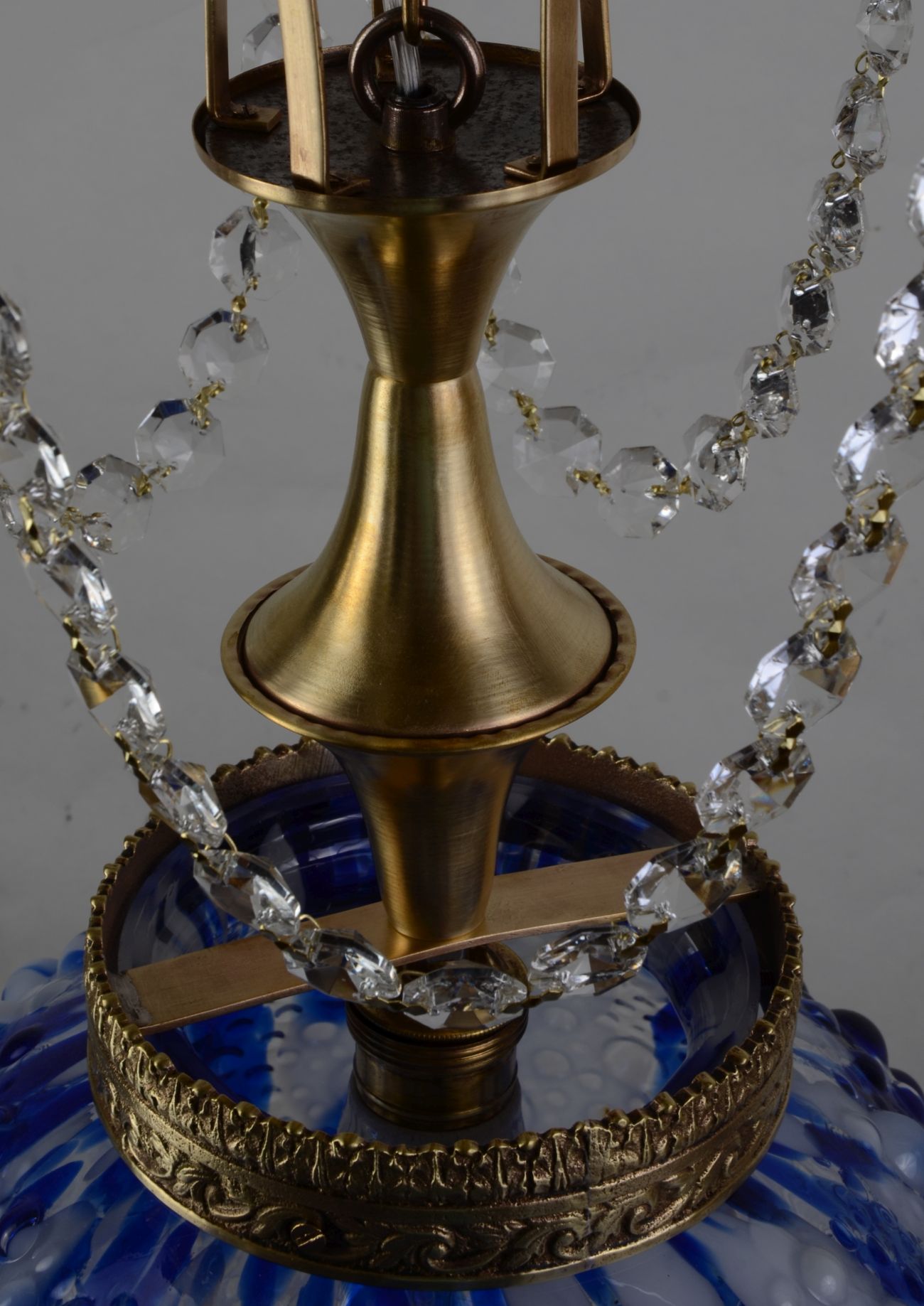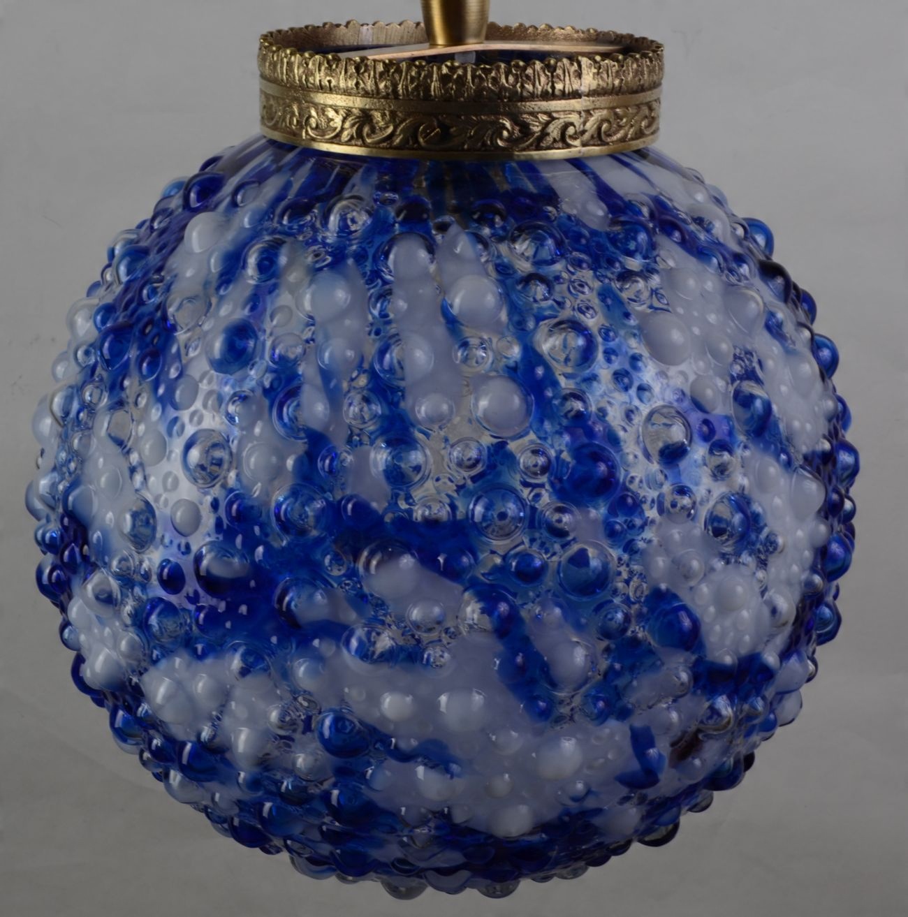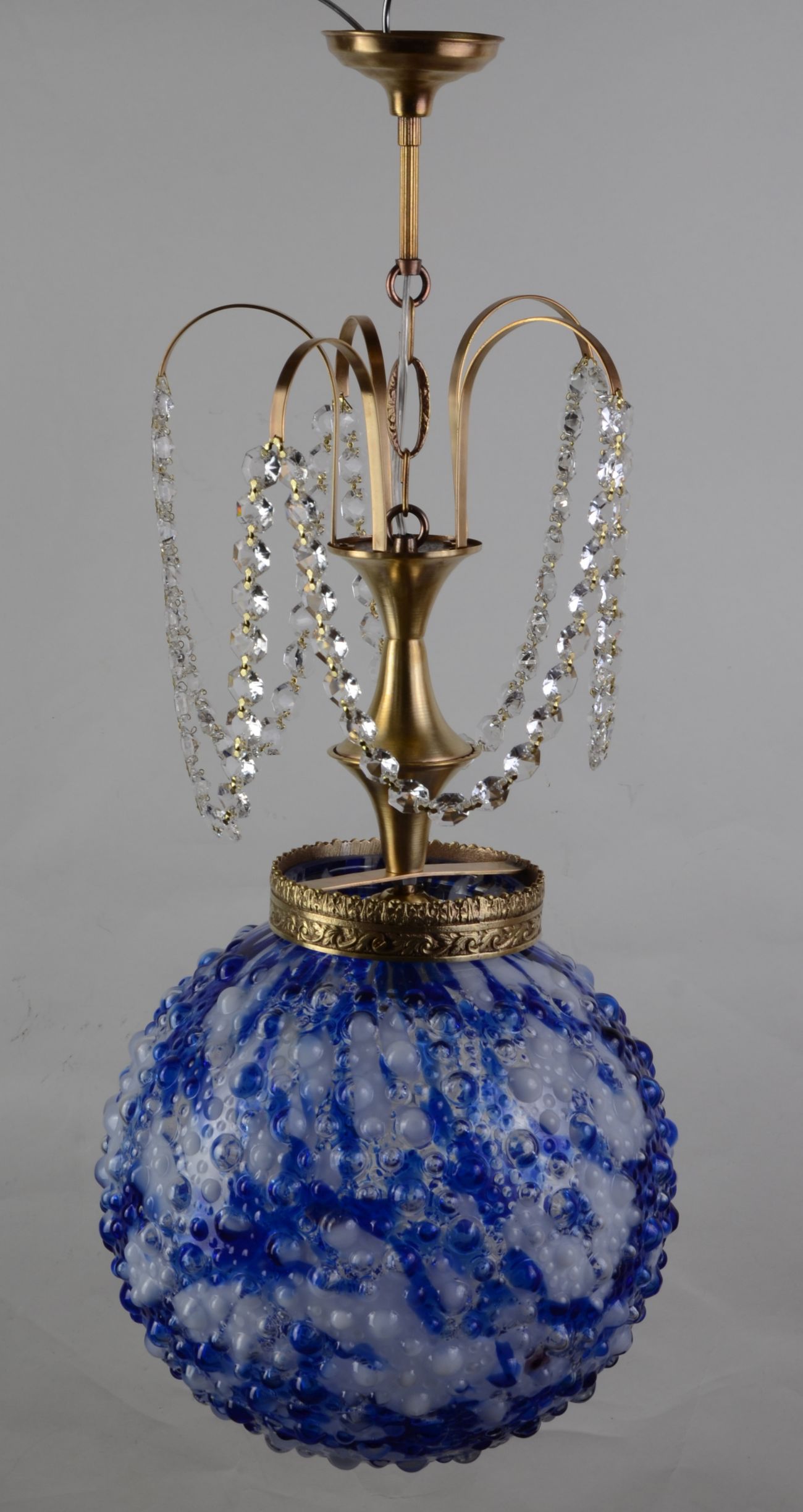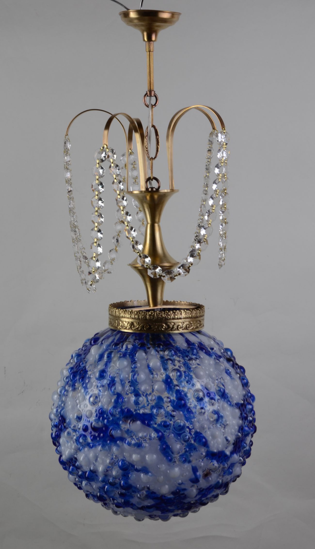 Лампа чудова і єдина в своєму роді! Конструкційні елементи виробу виготовлені з латуні золотистого кольору. Характерним елементом є оригінальний біло-блакитний абажур із муранського стекла з характерними бульбашковими декораціями. Лампа також прикрашена нитками блискучих скляних кристалів. Люстра радує своїм шармом! Варто придбати цю надзвичайно чудову та стильну річ.