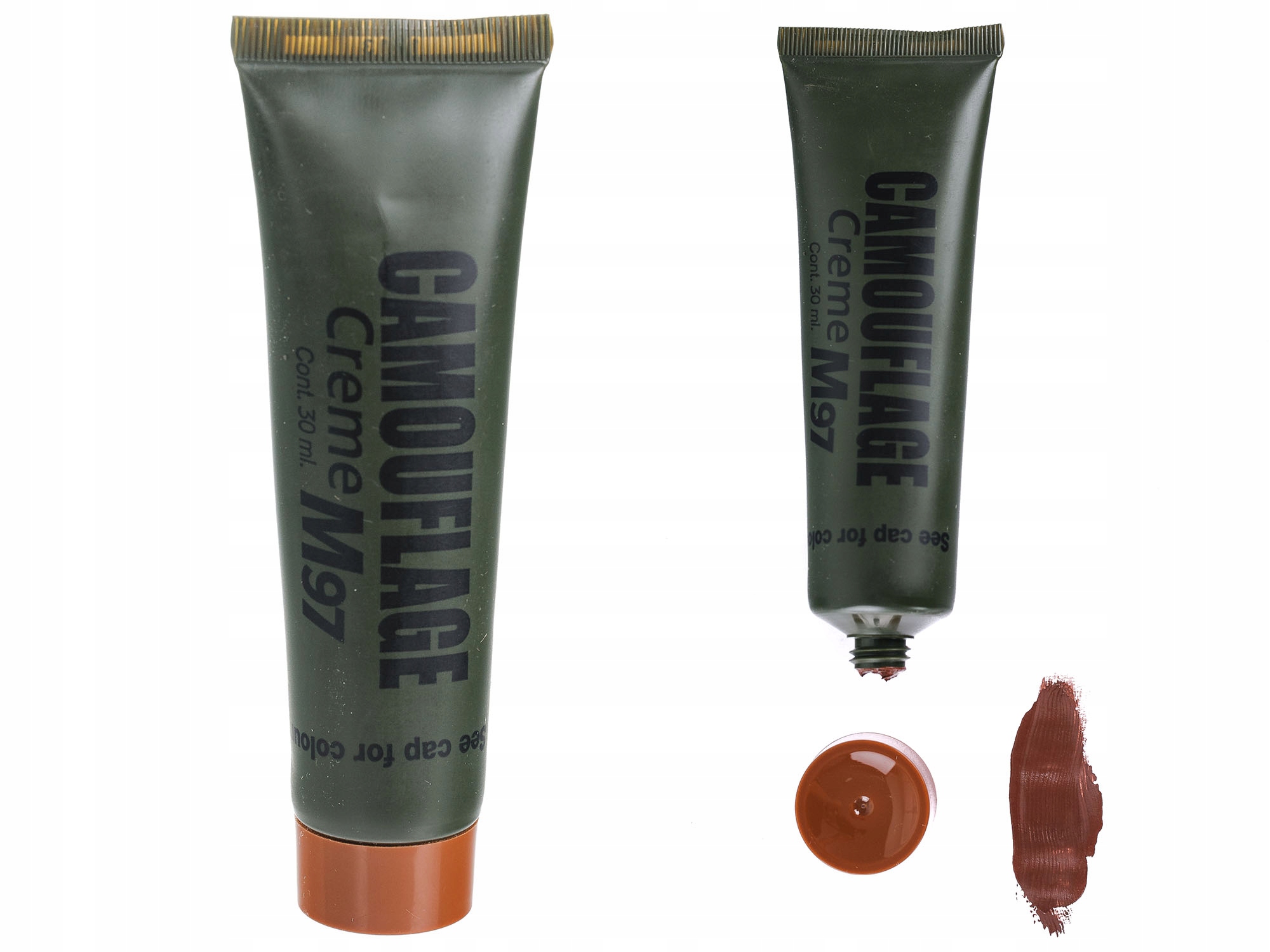 Оригінальна камуфляжна фарба M97 у тюбику – використовується НАТО. Військова специфікація гарантує найвищу якість. Чудовий продукт для маскування тіла від датської компанії KEMEX, який отримав визнання серед людей з усього світу. Рекомендовано професіоналами для мисливців, любителів виживання, пейнтболу та ентузіастів ASG. Крем має суттєву перевагу над популярними стіками і починає їх замінювати - його легше і швидше наносити і забезпечує набагато краще покриття. Спеціальний склад живить і зволожує шкіру, відлякує комах, має антиперспірантні та бактерицидні властивості - абсолютно нетоксичний. Після випаровування летючих речовин воно швидко висихає, залишаючи немаркий і міцний захисний шар. Крем М97 дуже ефективний, тюбика вистачає на багато застосувань. Додавання духів і масел гарантує приємний і нейтральний аромат. Зручний тюбик з кришкою кремового кольору. Випускається в трьох основних кольорах - ОЛИВОВИЙ, КОРИЧНЕВИЙ і ЧОРНИЙ. Відтінки, знайдені в природі.