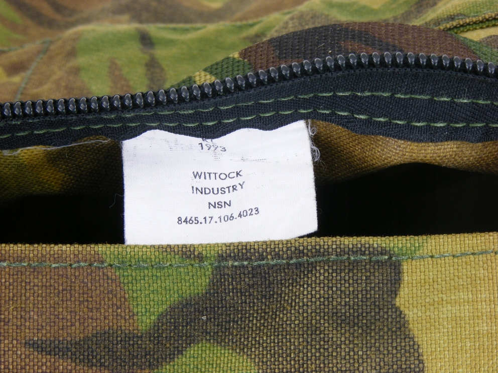 - Товста, міцна блискавка та приклад етикетки однієї з сумок із номером військового контракту (оригінал) і походженням