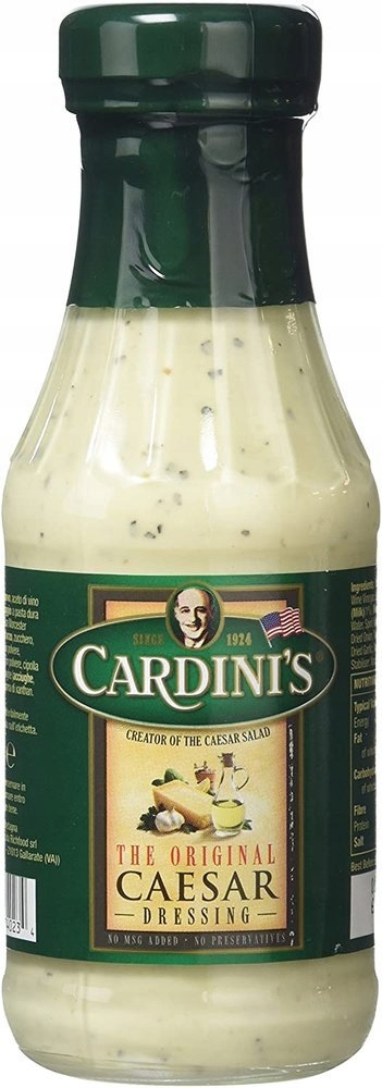 Опис: Заправка від Cardini's — це готовий соус до салату Цезар. В основі лежить оригінальний рецепт Цезаря Кардіні 1924 року – творця салату Цезар. Має кремову консистенцію та неповторний м’який смак з тонким поєднанням пармезану, цибулі та інших спецій.