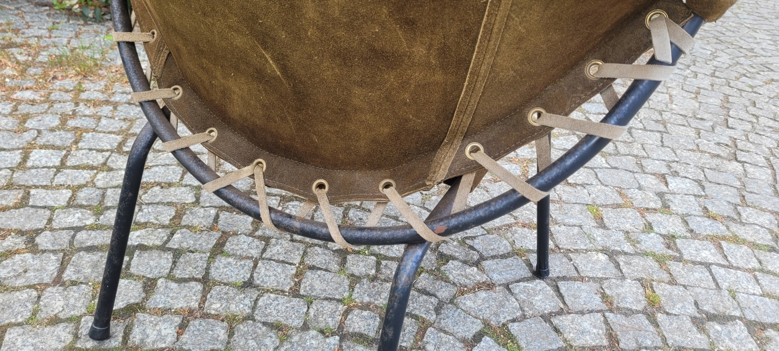 Оригінальне крісло Balloon, виготовлене німецьким виробником Lusch & Co у 1960-х роках. Дизайн приписують Люшу Ерцеугнісу. Каркас виготовлений з металу, оббивка з натуральної шкіри (замша) земляно-зеленого кольору. Діагональне сидіння дозволяє сидіти глибоко і зручно в кріслі. Має легку форму, оббивка мереживна, колір стриманий, а тонкі ніжки не обтяжують геометричну форму. Цей дизайн є одним із найбільш впізнаваних крісел епохи модерну середини століття.