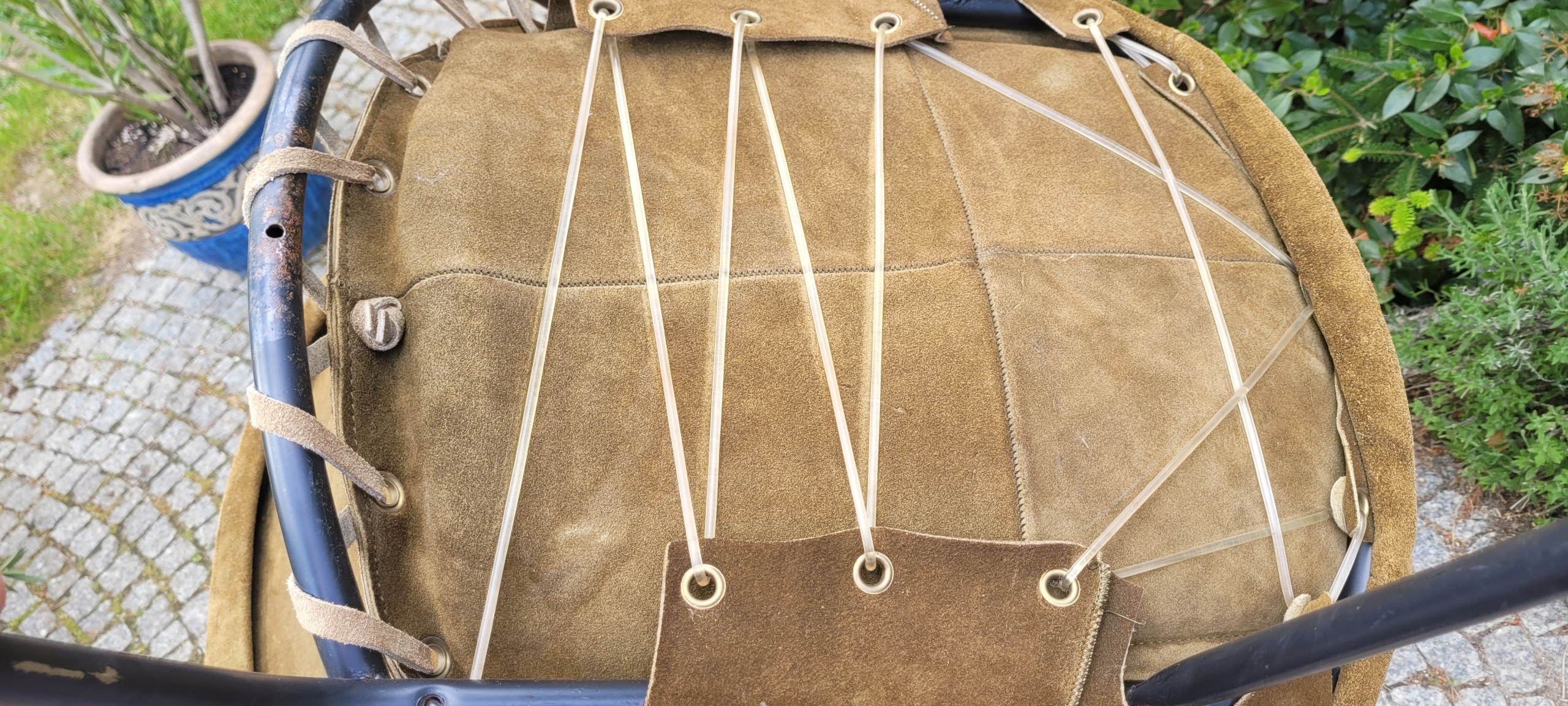 Крісло в оригінальному вінтажному стані. Має невеликі подряпини на металевих частинах, незначні зміни кольору, потертості та легкі розриви шкіри з боків. Сидіння на висоті 38 см.