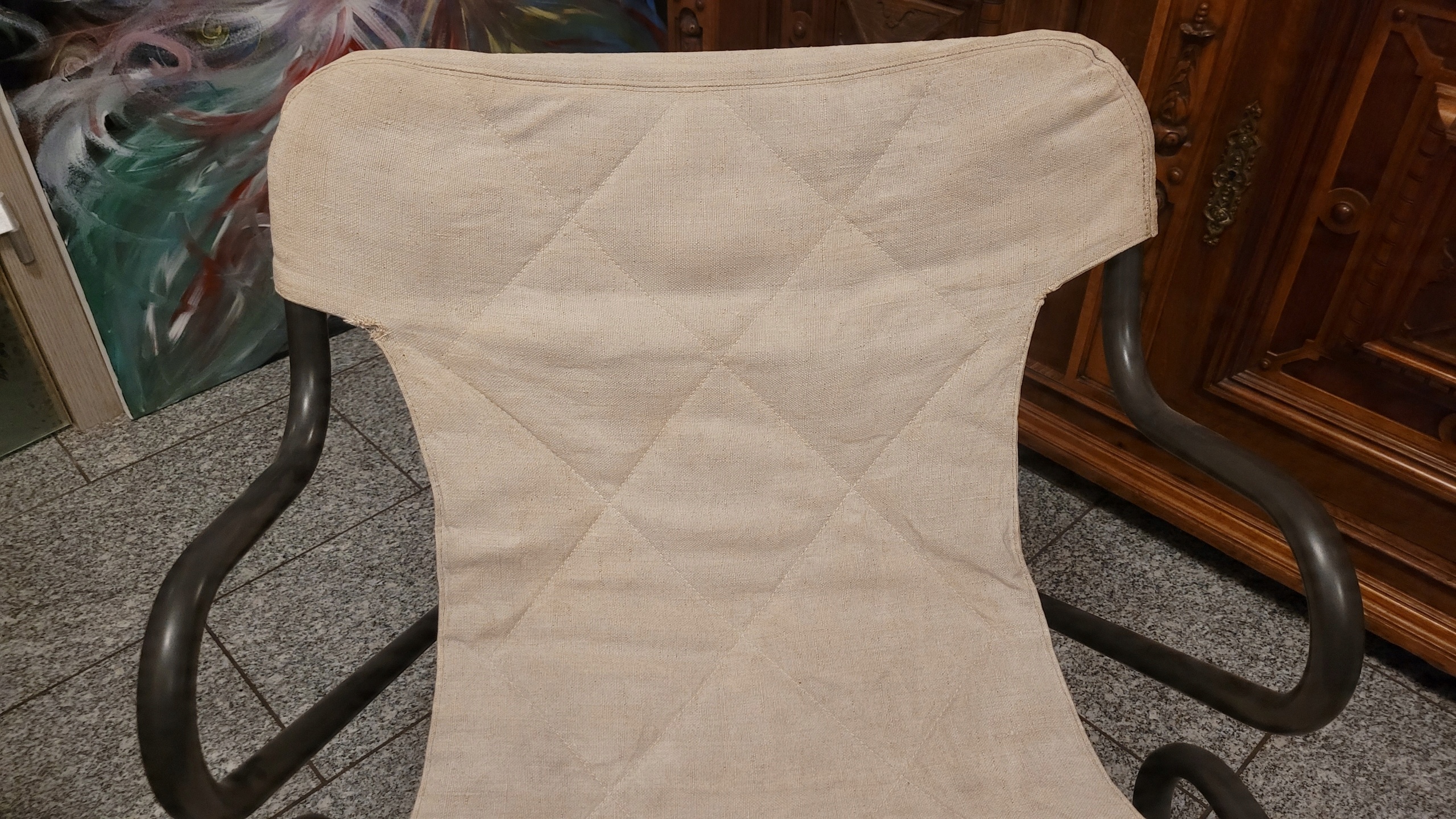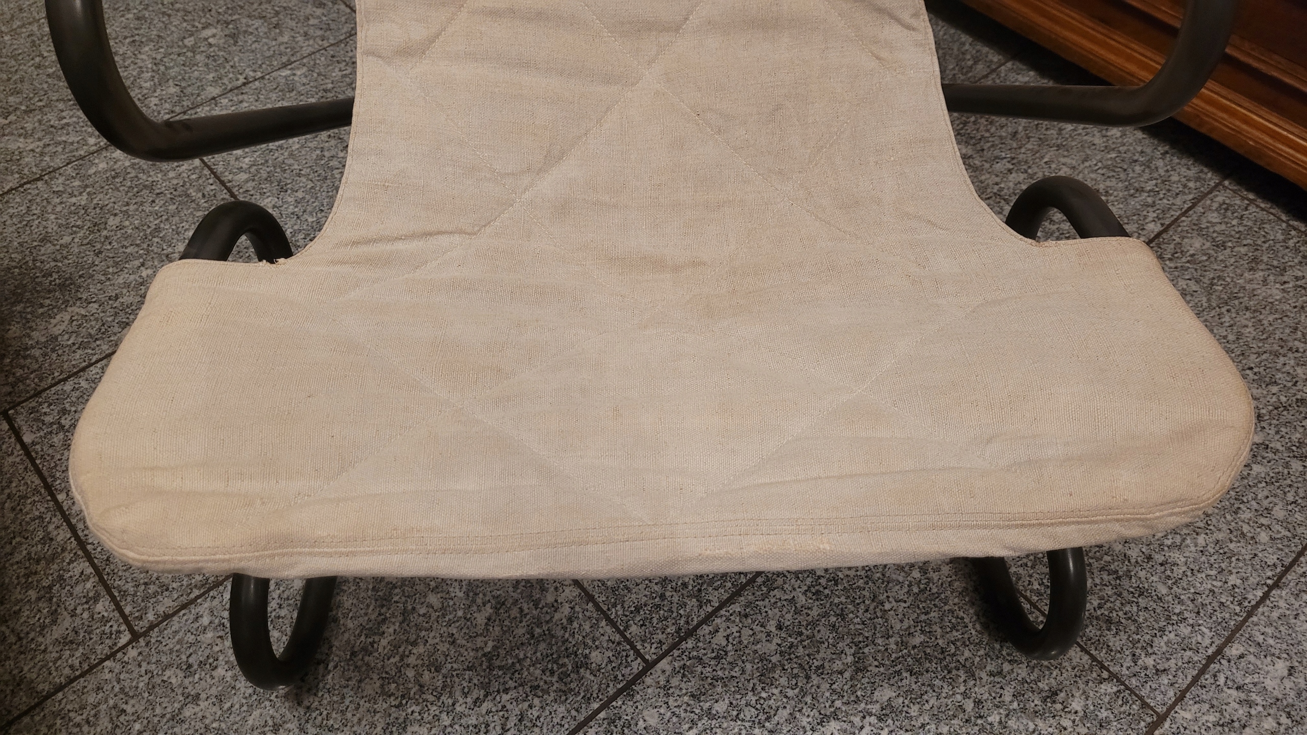 Скандинавське, унікальне крісло. Виготовлено зі сталі та льону 1970-х рр. Стійке крісло, ергономічний дизайн, злегка прогинається (розгойдується) під час сидіння. Сидіння з льону, знімається для прання, дуже зручне і міцне. Крісло в хорошому стані, на фото видно поверхневі сліди використання.