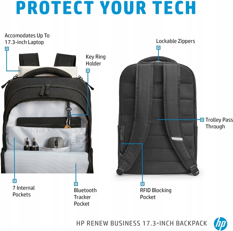 HP Renew Business 17.3 Backpack 3E2U5AAR, оригінальний рюкзак HP, призначений для ноутбуків з діагоналлю до 17.3", продукт серії business, найвища якість якість виготовлення та міцність вище середнього, до 13 відділень, кишень і відділень, RFID-кишеня для зберігання карток, двостороння блискавка на основних кишенях. Наступник вилученої моделі 2SC67AA