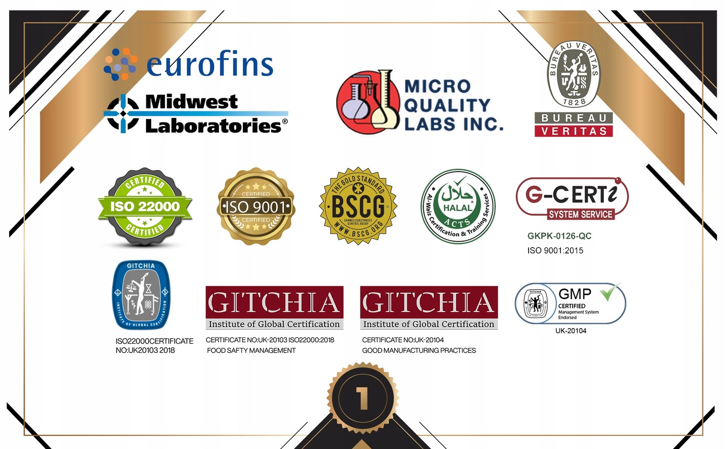 Випробовувано в лабораторії Eurofins, MidWest Laboraties USA, BSCG USA, Micro Quality Labs, Bureau Veritas.