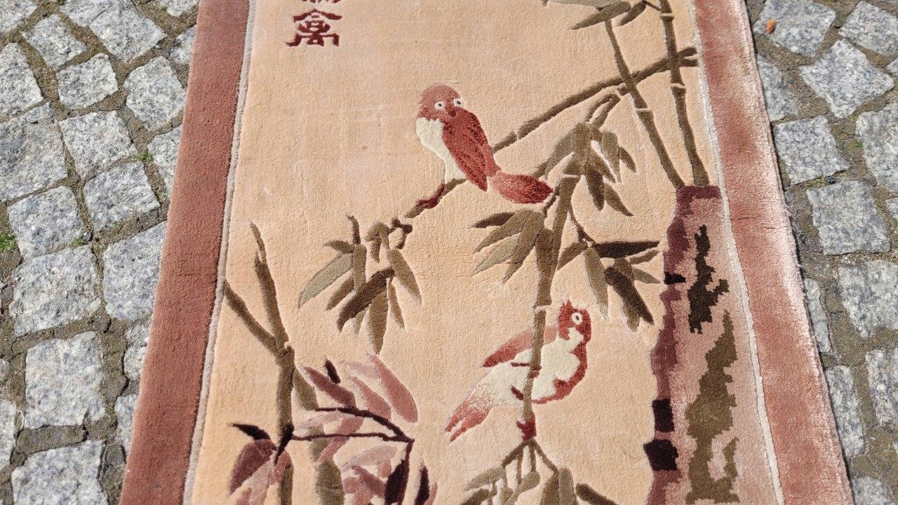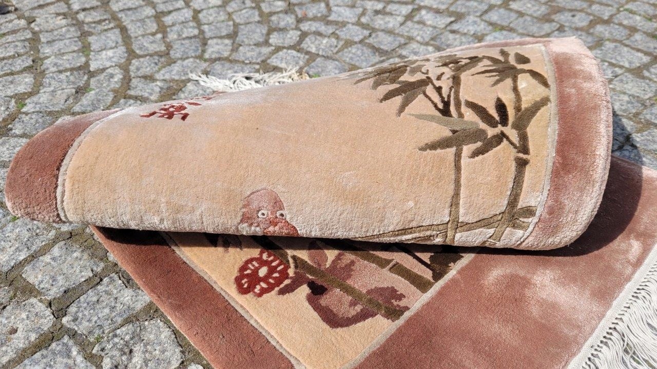 Гарний китайський килим. Ручне виткання з шовку. Характеризується компактним, блискучим флісом, приємним на дотик, красивими кольорами та візерунками. Килим в дуже хорошому стані, мінуси видно на фото.