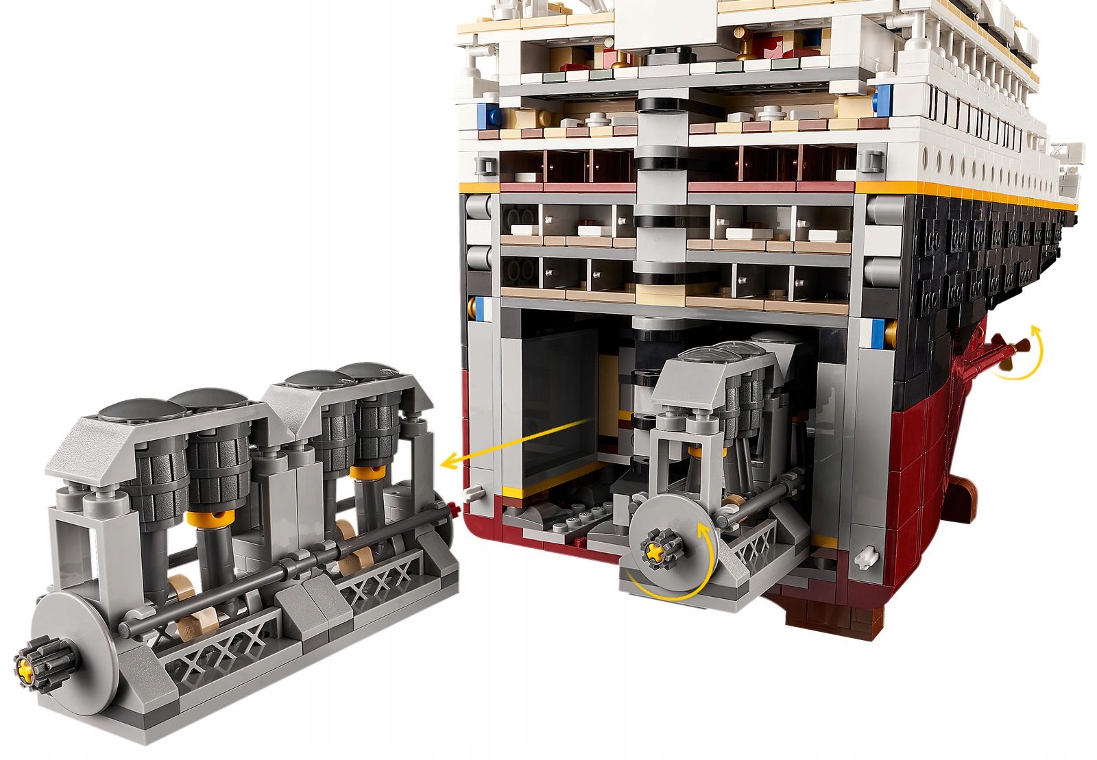 - Корабель розділений на три секції, щоб ви могли зазирнути всередину. Побудувавши її, ви зможете милуватися парадними сходами, каютами, їдальнею, кімнатою для куріння, читальною залою та басейном.