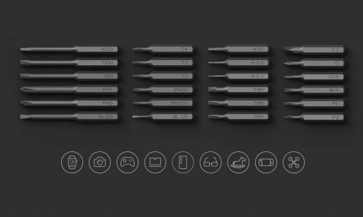 Високоякісний набір із 24 насадок із інструментальної сталі S2, що гарантує довговічність і міцність, а твердість насадок до 60HRC*. Біти - завдяки різноманіттю типів - ідеально підходять для розбирання і збирання більшості стандартних електронних пристроїв і нової дрібної побутової техніки. Працюйте на таких пристроях, як годинники, камери, ігрові консолі, ноутбуки, смартфони, окуляри, іграшки, портативні пристрої та дрони.