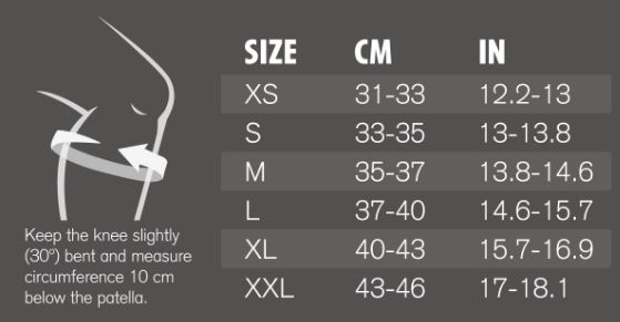 Наколінник доступний у 6 розмірах. Щоб відрегулювати розмір, зігніть ногу, потім виміряйте окружність найвужчої частини під колінним суглобом.