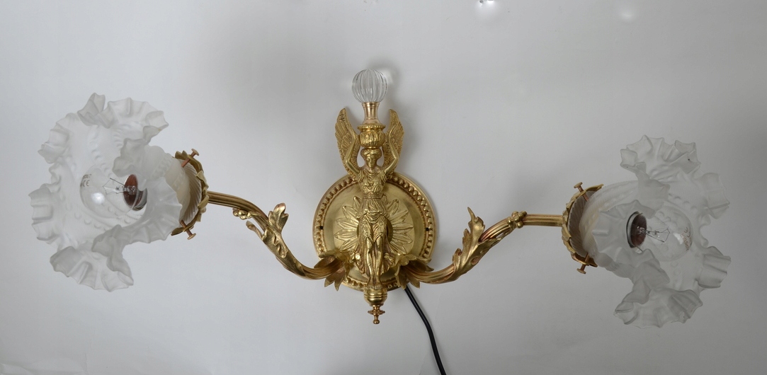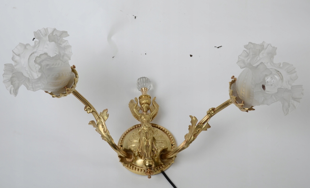 Предметом аукціону є оригінальний, чудово виготовлений настінний світильник з двома кронштейнами з Іспанії. Настінний світильник виготовлений з латуні золотого кольору. Погляд привертає неймовірна точність виконання та чудове оздоблення. Предмет дуже міцно виготовлений. З центру виходять два рукави, увінчані красивими абажурами, схожими на квіти. Привертає увагу і центральна частина настінного світильника, прикрашена зображенням ангела-жінки зі скляною кулею над головою. Настінний світильник буде виглядати унікально в будь-якому інтер'єрі. Своєю оригінальністю він порадує кожного. Однозначно рекомендую!!!!