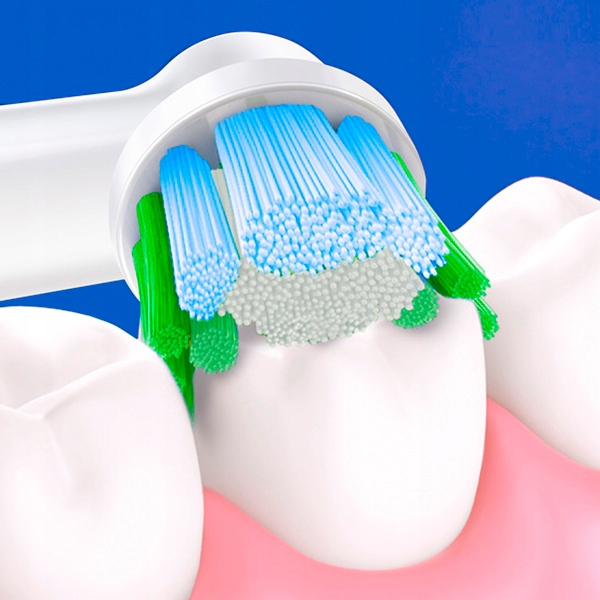 Форма, навіяна професійним стоматологічним обладнанням. Наконечник Oral-B Precision Clean створений за зразком кращих стоматологічних інструментів, призначених для очищення ротової порожнини. Форма наконечника дозволяє волокнам ретельно покривати кожен зуб і забезпечує індивідуально адаптований метод чищення. Видаляє на 100% більше нальоту, ніж звичайна ручна зубна щітка. Щетина голівки Precision Clean проникає глибоко між зубами та покриває більшу площу поверхні, забезпечуючи набагато більш ретельне очищення, ніж при використанні звичайної ручної зубної щітки. Ефективність дії ще більше підвищується завдяки технології очищення 3D, що використовується в електричних зубних щітках Oral-B, яка працює з точністю майже 48 000 рухів на хвилину. Порівняно з 600 рухами, які ми робимо в середньому під час чищення зубів ручною зубною щіткою, вона на 100% ефективніша для видалення нальоту.