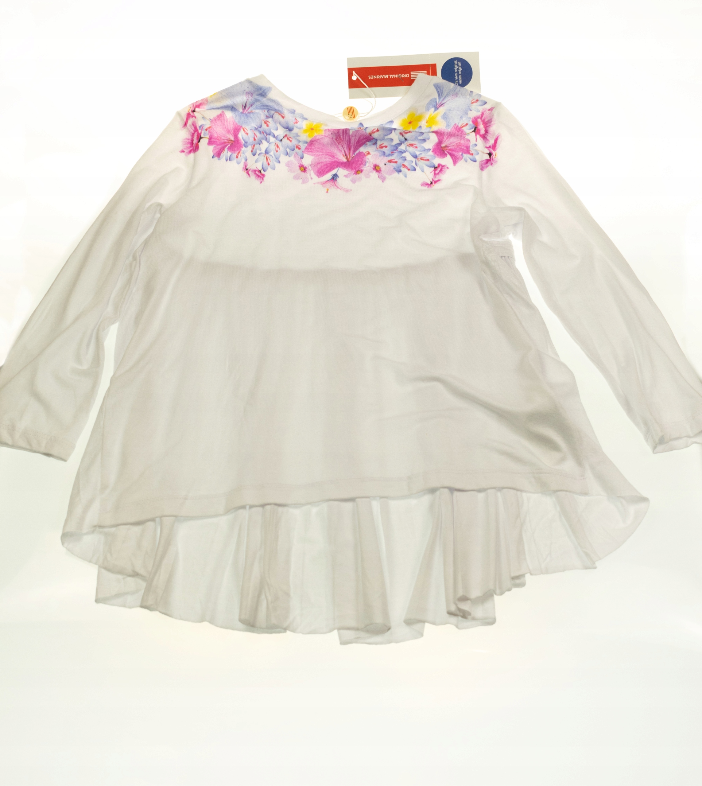 Чудова туніка для дівчинки з довгими рукавами, ідеально підійде до джинсів, спідниці або легінсів , білий з квітковим мотивом спереду. На спині довша, відрізана на лопатках, з вшитою оборкою зі складками, дуже гарна та повітряна.