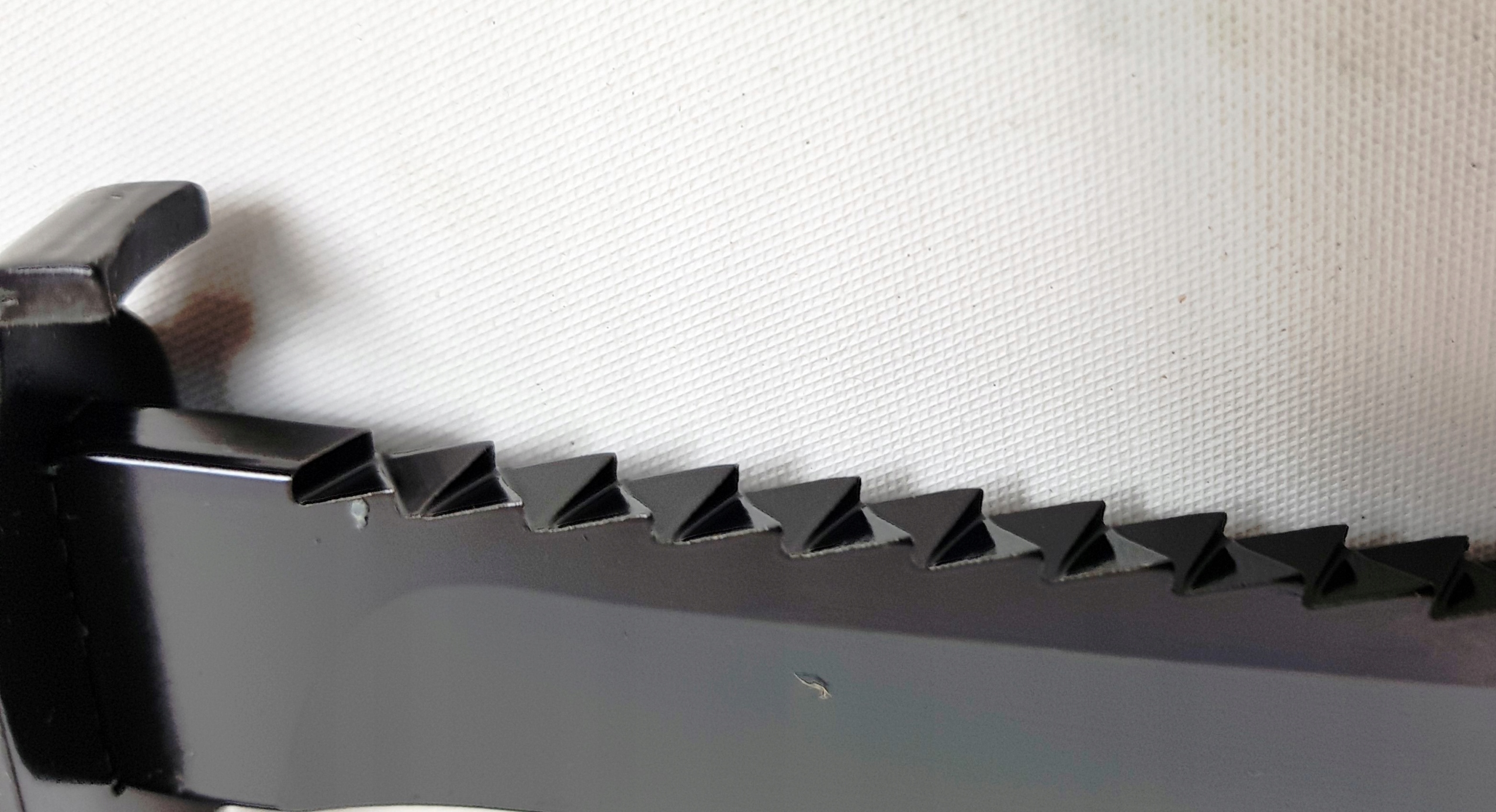 Лезо - товщиною 4 мм, виготовлене з пружинної сталі, загартованої до 55 HRC, забезпечує збалансовану еластичність і відповідну твердість. Лезо покрите чорним покриттям для захисту від корозії. Гладке полотно, на зворотному боці полотна розташована багатофункціональна дворядна пилка. В основі леза є сталевий гард, що захищає руку від неконтрольованого ковзання по лезу та виконує функцію відкривачки для пляшок.