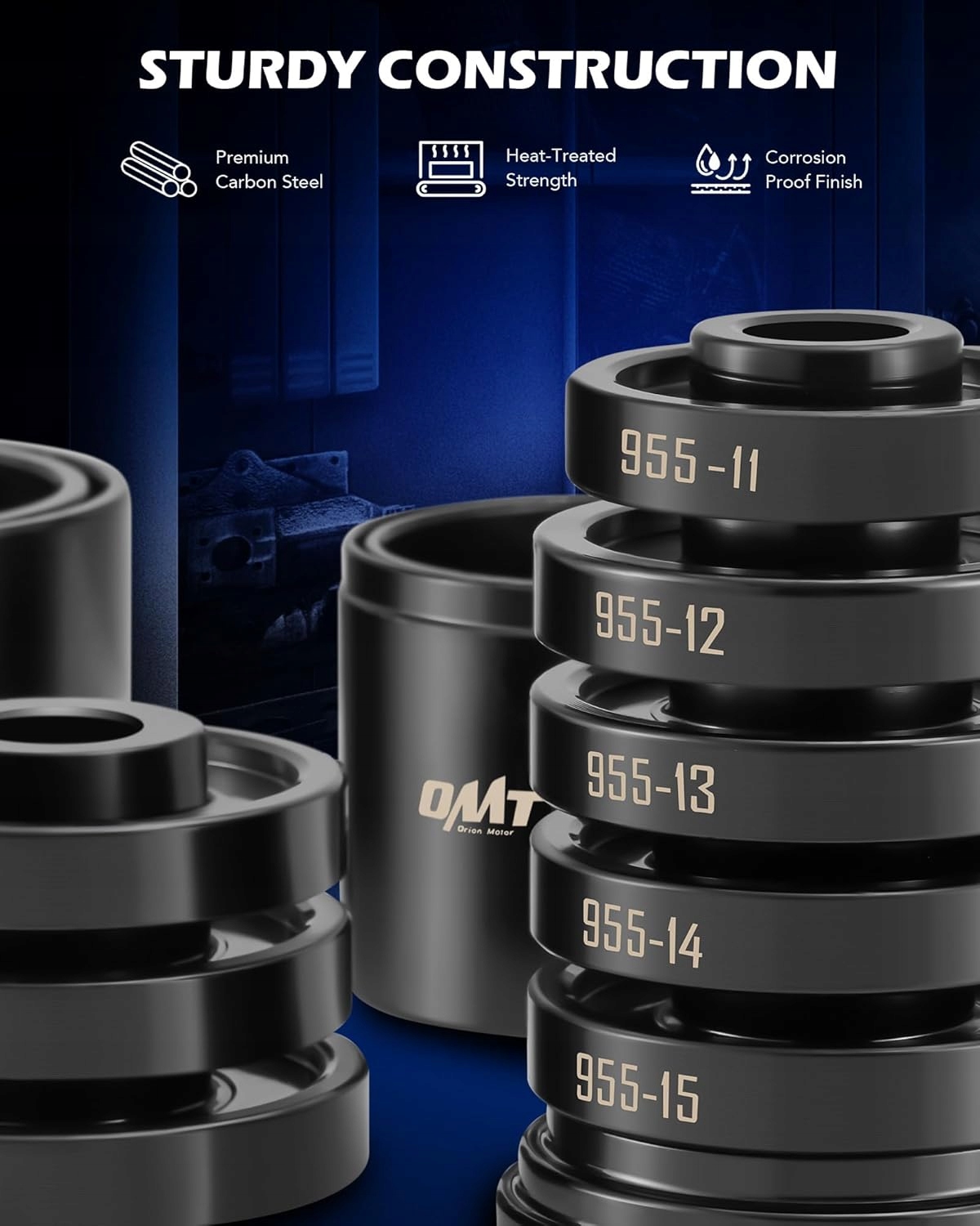 - Надійна конструкція: виготовлений із термообробленої конструкційної сталі 1045 із чорним оксидним покриттям, цей прес-комплект колісних підшипників гарантує чудову стійкість до корозії та довговічність навіть при інтенсивному використанні.