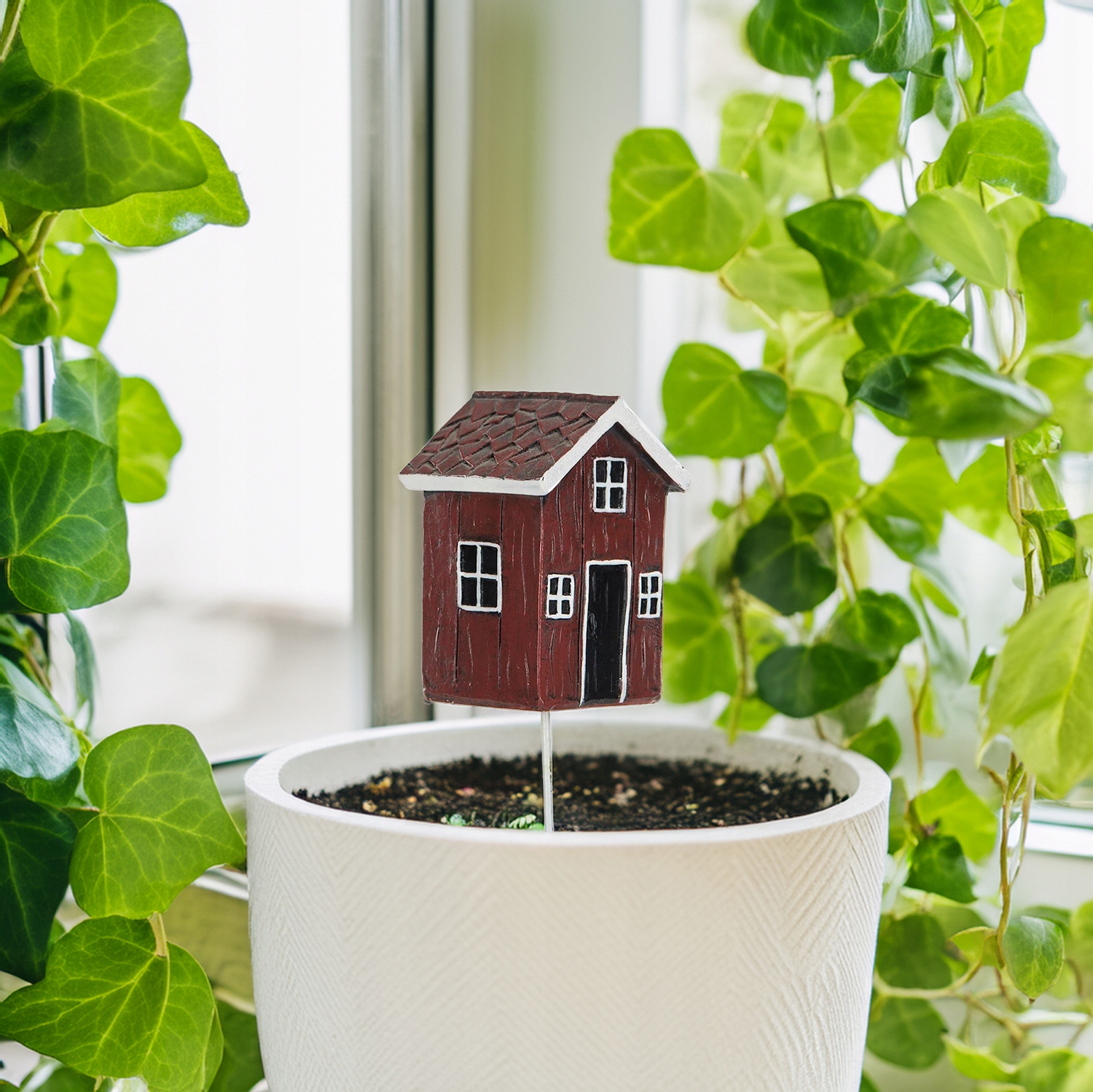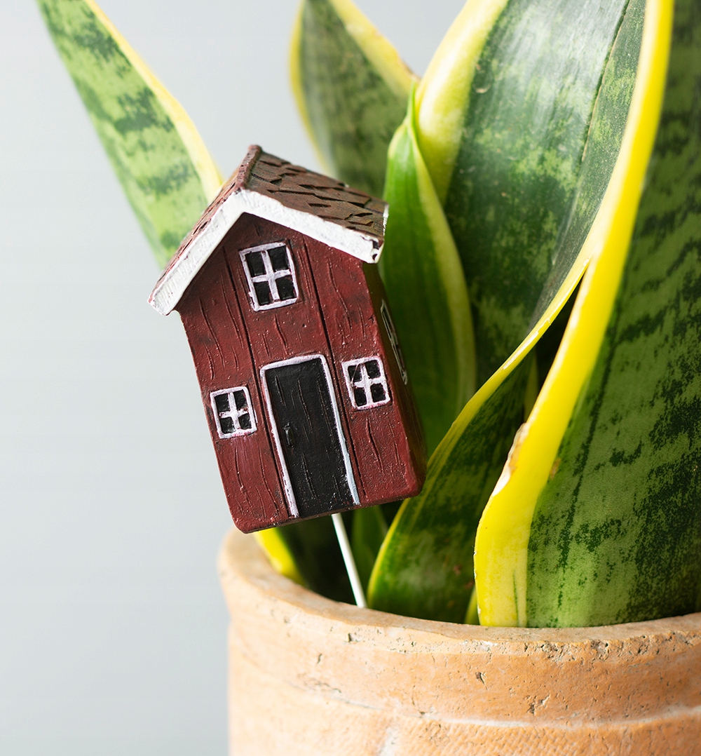 Коли ставите будиночок у горщику, установіть його міні-ліхтариками, фігурками або природними аксесуарами, такими як мох або гілочки. Так ви створите атмосферне оформлення, що нагадує казкове село. Він чудово виглядає в новорічних прикрасах в оточенні свічок і соснових шишок, а у весняних композиціях з цибулинних квітів додасть неповторного шарму вашим прикрасам.