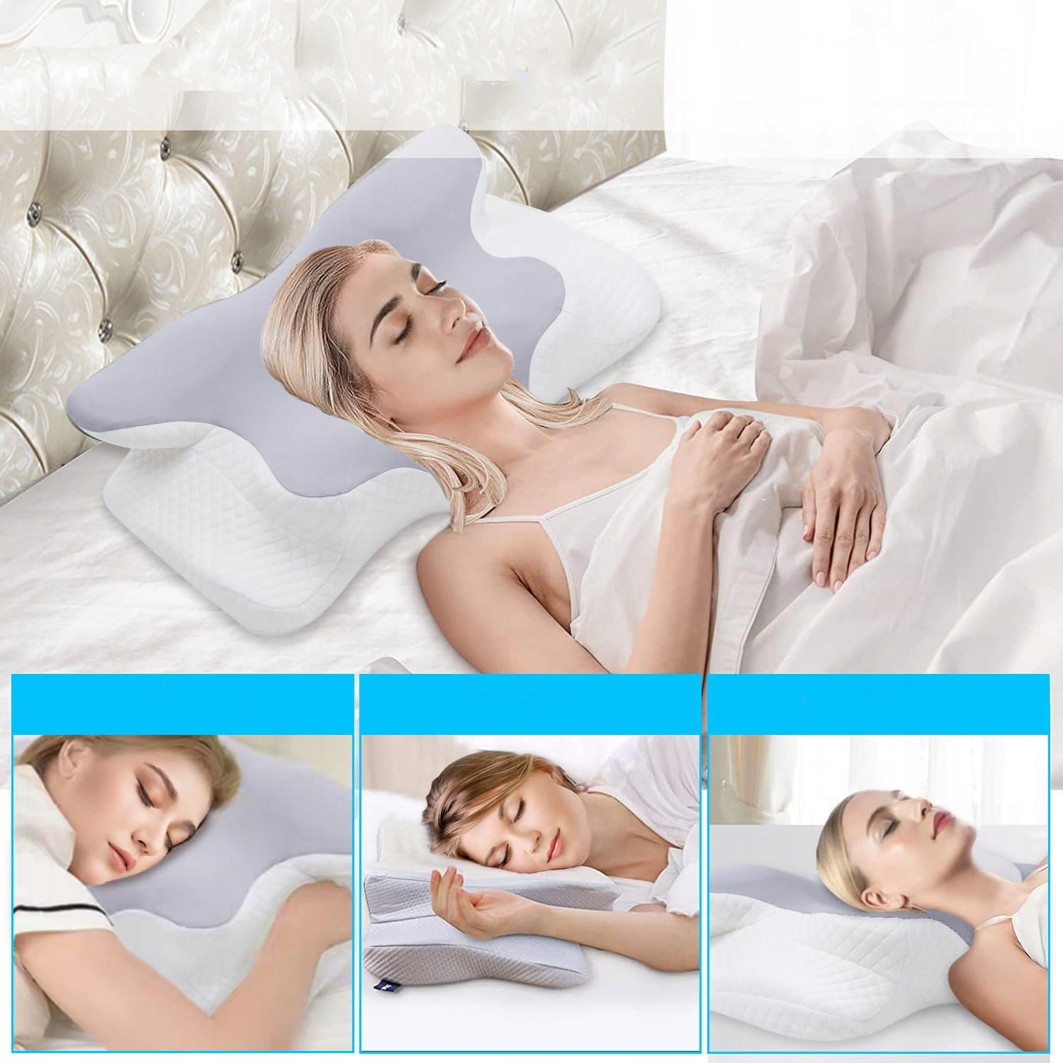 Ця ортопедична подушка має форму метелика, контур шиї та ергономічний дизайн шийної порожнини, завдяки чому вона адаптується до природних вигинів тіла, забезпечуючи оптимальний потік повітря та зменшуючи хропіння, що забезпечує більш спокійний сон.