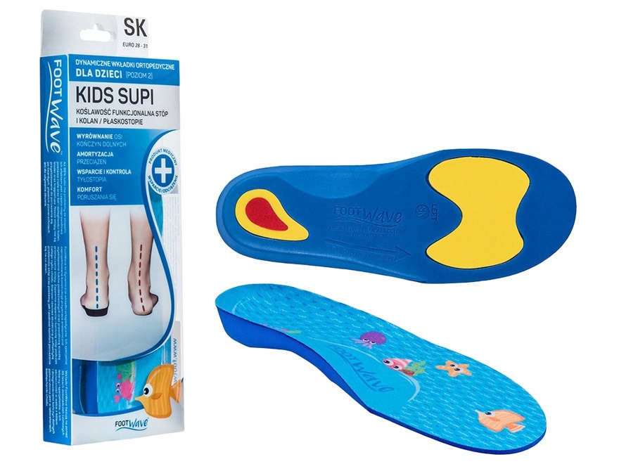 Динамічні ортопедичні устілки FootWave KIDS SUPI - це безпечні медичні вкладиші, призначені для дітей з вальгусними стопами і колінами або плоскостопістю. Унікальний дизайн динамічних вставок FootWave сприяє зменшенню болю в стопах дитини, особливо в п'ятці, підвищує стабільність і комфорт рухів. Устілки FootWave Kids можна використовувати як для лікування вальгусної та плоскостопості у дітей, так і для профілактики перерахованих вище захворювань. Вони допомагають у період інтенсивного росту дитини.