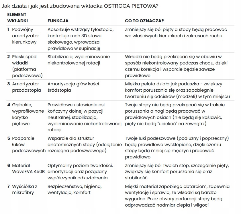 Динамічні устілки для п’яткової шпори FootWave підтримують склепіння стопи та зменшують напругу в області підошовної фасції, зменшуючи тиск на хворобливу область. Це зменшує відчуття болю в п’яті та покращує комфортність рухів. Крім того, корекція осі руху кінцівок запобігає утворенню п'яткової шпори. Завдяки особливій структурі динамічні устілки стабілізують п’яту, а амортизатори, які в них містяться, зменшують перевантаження та захищають від негативних наслідків ударів, що виникають під час руху.