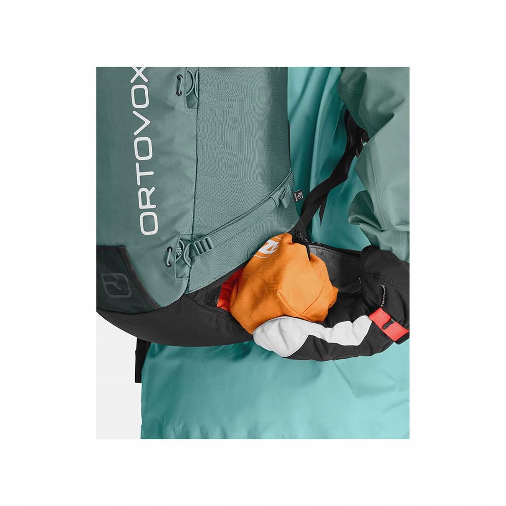 Ortovox Ravin призначений для вимогливих фрієдерів, для яких легкий доступ до найбільш необхідного обладнання є ключовим питанням. Однією з найбільших переваг цієї моделі є можливість прикріплювати лижі 3 способами. Традиційний A-SSFIX, D-SKIFIX та унікальний метод, схожий на вкладення D-Fifix, але дозволяє, але забезпечує кріплення та демонтаж лиж під час носіння. Це збільшує безпеку та прискорює перехід до пункту призначення. Рюкзак клапоть закритий спеціально розробленою пряжкою, щоб ви могли легко дістатися до основного відсіку. Основна камера розділена на 3 розділи. Відсік, присвячений ABC Avalanche ABC, основній частині завантаження та відділенням для встановлення захисного захисту хребта захисника хребта ( не входить до набору - ви повинні придбати його окремо ). Основна камера розділена знизу, закрившись на блискавку. До головної камери ми маємо можливість отримати доступ зверху після відключення клаптя, від боку через повзунок і знизу через спеціально розроблений кишеню з швидким доступом. Ця кишеня - це нижня частина основної камери, і ми можемо транспортувати в ній, напр. На передній частині є кишеня карти з прихованою ручкою ключа. На клапті є додаткова кишеня для найбільш необхідних дрібничок. Всередині ховається шолом. Це дозволяє встановити та отримати доступ до крижаної сокири без необхідності зняти рюкзак. Він сумісний із системами гідратації, на одному з джгутів він має невелику гнучку кишеню для невеликих закусок і на стегні - смуга. Це дозволяє транспортувати мотузку, має плавно регульовану скриню з свистом та аварійною карткою з короткою інструкцією S.O.S. і місце для найбільш необхідної інформації про користувача.
