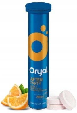 Склад: кислота: лимонна кислота; глюкоза; карбонат калію; бікарбонат натрію; хлористий натрій; карбонат магнію; кальцію карбонат; апельсиновий смак; холіну бітартрат; сушеного концентрату червоного буряка; підсолоджувач: сахарин натрію; рибофлавіну 5'-фосфат натрію. Дієтична добавка Oryal After Party містить цукор та підсолоджувач.