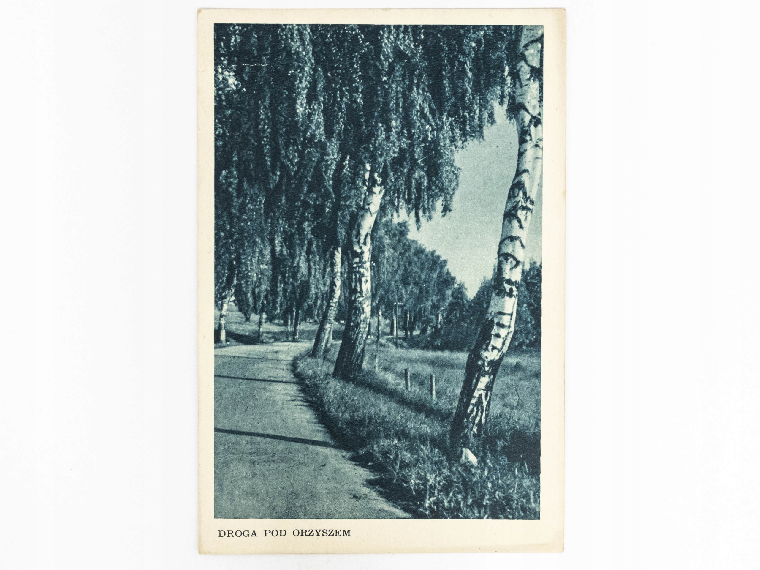 стара листівка - orzysz - асфальтова дорога серед берези 1950 -х років. PRL