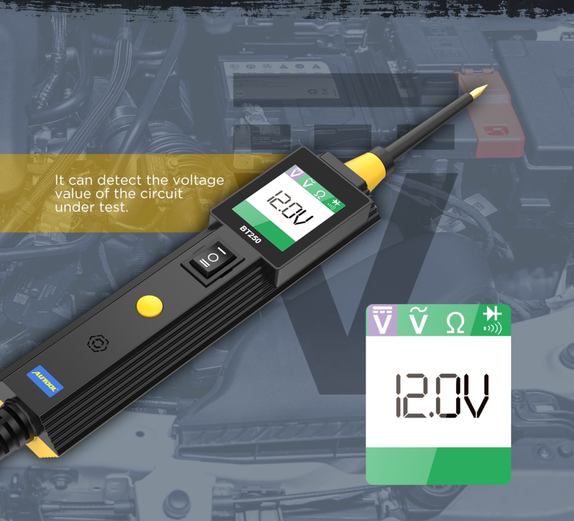 Предметом пропозиції є тестер ланцюгів Autool BT250 з функцією мультиметра (V). Він має вбудований тестер реле, датчик короткого замикання, маси, відсутності безперервності ланцюга тощо.