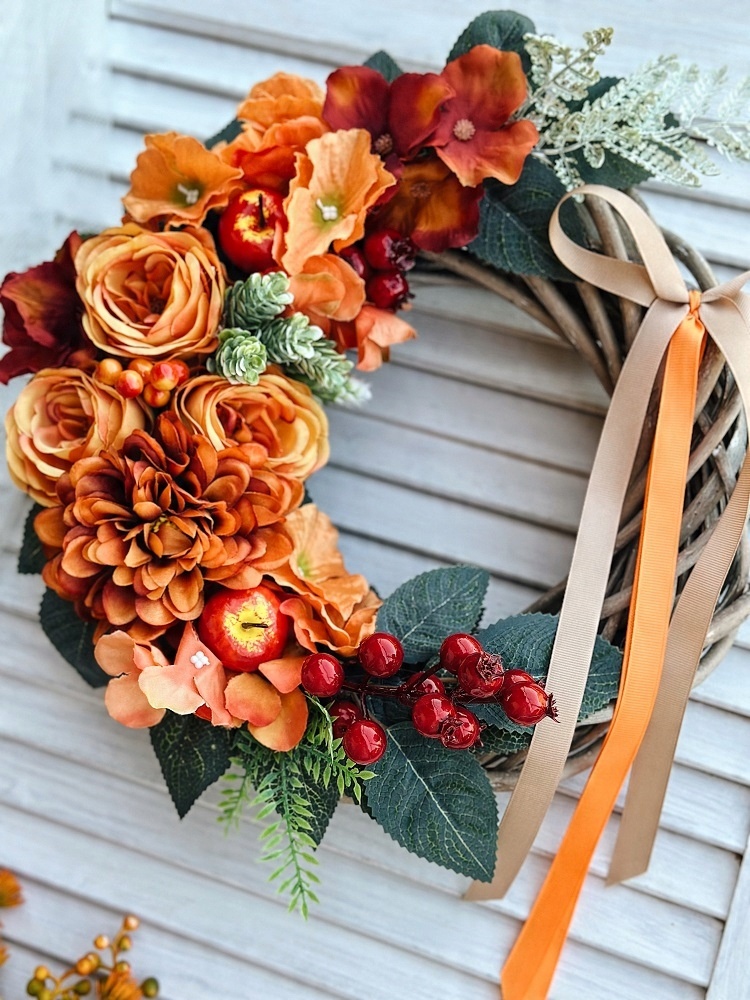 Осінній вінок, прикрашений штучними квітами троянд, жоржин, гортензій і різноманітними аксесуарами, листям і бантом.