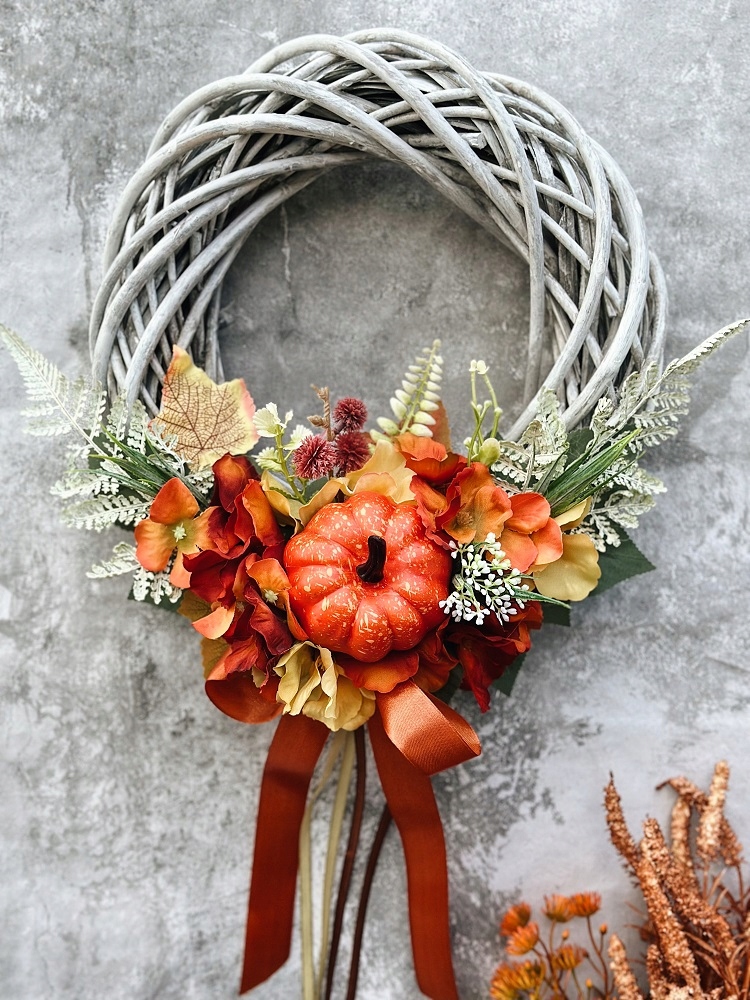 ОСІННІЙ ВІНОК НА ПЛЕТЕНІ ДВЕРІ, ШТУЧНІ КВІТИ, ВІНОК З ГАРБУЗА