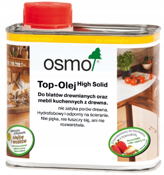 Top-Oil для кухонних стільниць Osmo — це покриття для на основі натуральних масел і воску, розроблений спеціально для дерев'яних кухонних стільниць і меблів. Він дозволяє деревині вільно дихати і не тріскається, не лущиться і не сколюється. Поверхня, покрита ним, стійка до забруднень від вина, пива, коли, кави, чаю, фруктових соків, молока, води тощо відповідно до стандарту DIN 68861-1A. Зберігає природну красу дерев'яних поверхонь, захищаючи їх від вологи, плям і побутових засобів для чищення. Після висихання це екологічне покриття є безпечним для людей, тварин і рослин (це безпечне покриття для дитячих іграшок відповідно до EN 71.3 і стійке до слини та поту відповідно до DIN 53160). Воно також схвалено для контакту з харчовими продуктами.