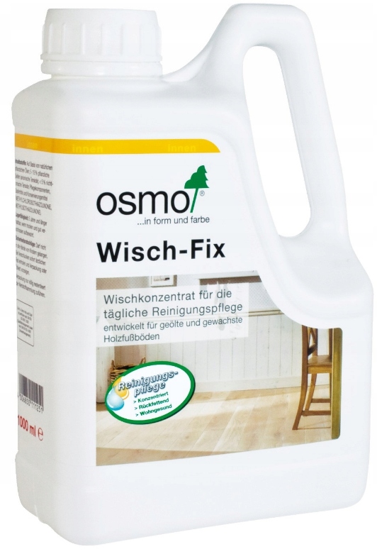 Osmo Wisch-Fix - це водорозчинний концентрат для щоденного миття підлоги, особливо рекомендований для дерев'яних підлог, оброблених Hard Wax Oil. Цей засіб містить мила на основі натуральних рослинних олій, тому на відміну від звичайних миючих засобів не сушить деревину. Очищає поверхню, одночасно доглядаючи та зволожуючи її. Має знежирюючий ефект і не стерилізує підлогу. Особливо ефективно видаляє плями від коли, соків, пива, молока, кави та інших побутових забруднень. Wisch-FIX не містить барвників і ароматизаторів, делікатний і приємний для шкіри; безпечно - біологічно розкладається