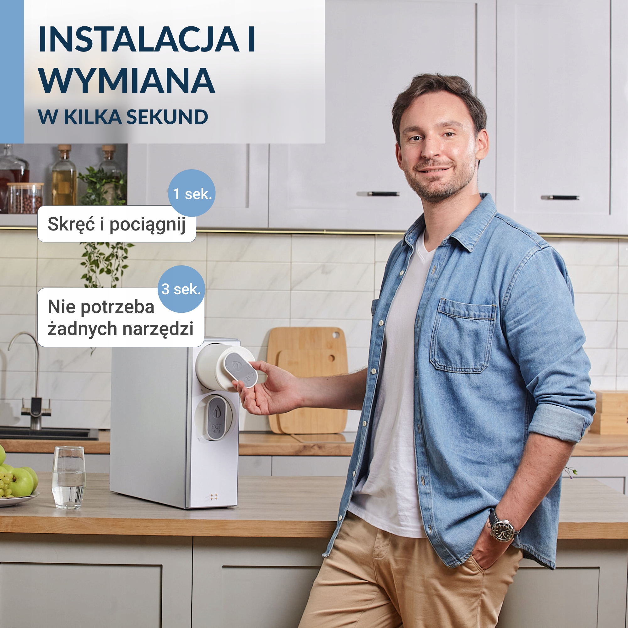 Технологія легкої зміни робить процес заміни фільтра простим і швидким. Користувачам не потрібно звертатися до професіоналів, оскільки фільтри можна самостійно обмінятись, що дозволяє заощадити час і гроші. 4 Завдяки цьому домашній обладнання, наприклад, чайник, кавоварка або праска, буде служити довше. Очищена вода ідеально підходить для приготування різноманітних страв та напоїв, що дозволяє забути про відвідування точок наповнення або подачі води у важких циліндрах.