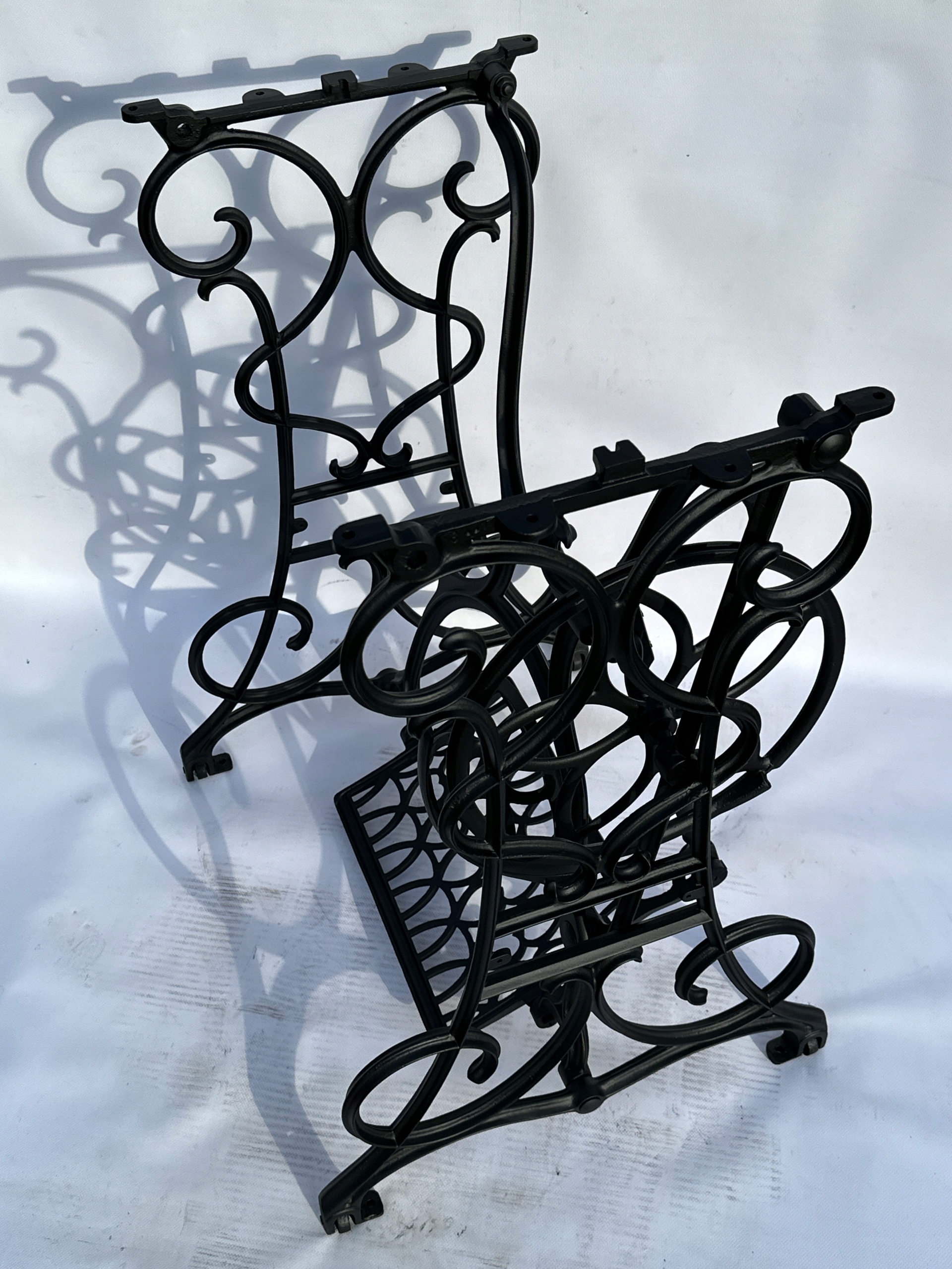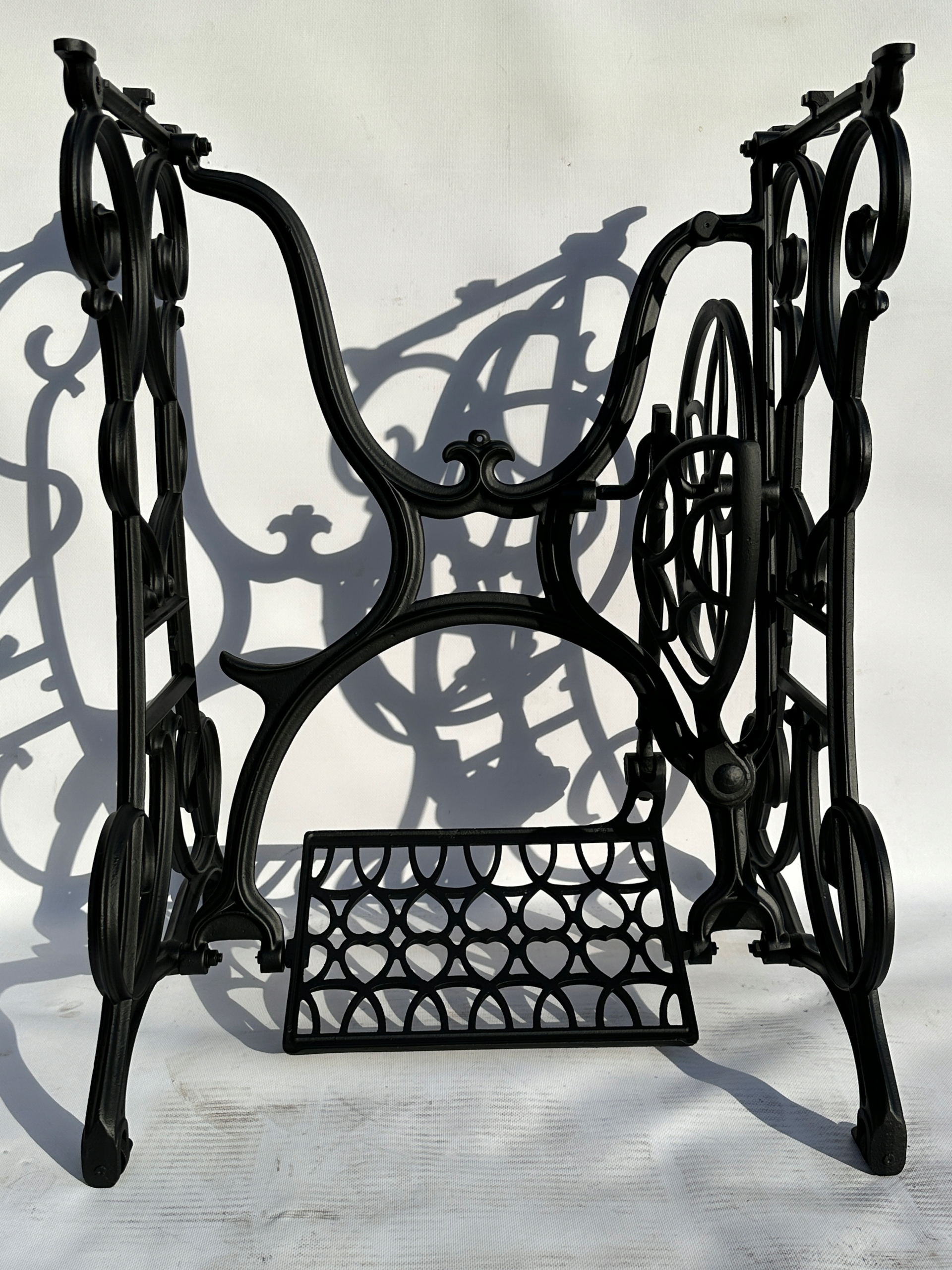 Предмет продажу стара чавунна швейна машина. Дуже гарний візерунок з сердечками, зустрічається рідше. Усі 4 колеса розташовані внизу.