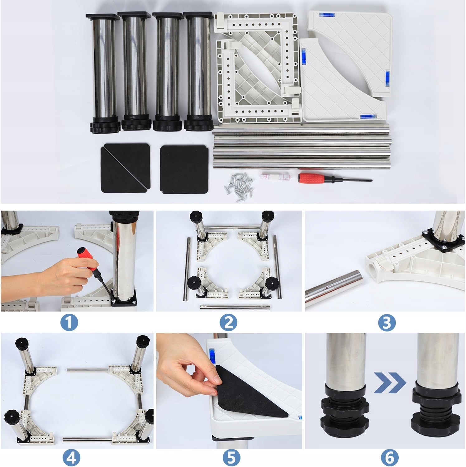Регульована підставка для побутової техніки DEWEL - надійне і практичне рішення для стійкої установки обладнання, що стоїть на підлозі, наприклад холодильників, міні-холодильників, посудомийних машин, морозильних камер, кухонних шаф або мобільних кондиціонерів. Продукт призначений тільки для статичних пристроїв - він не підходить для пральних машин або інших пристроїв, які генерують сильну вібрацію під час роботи.