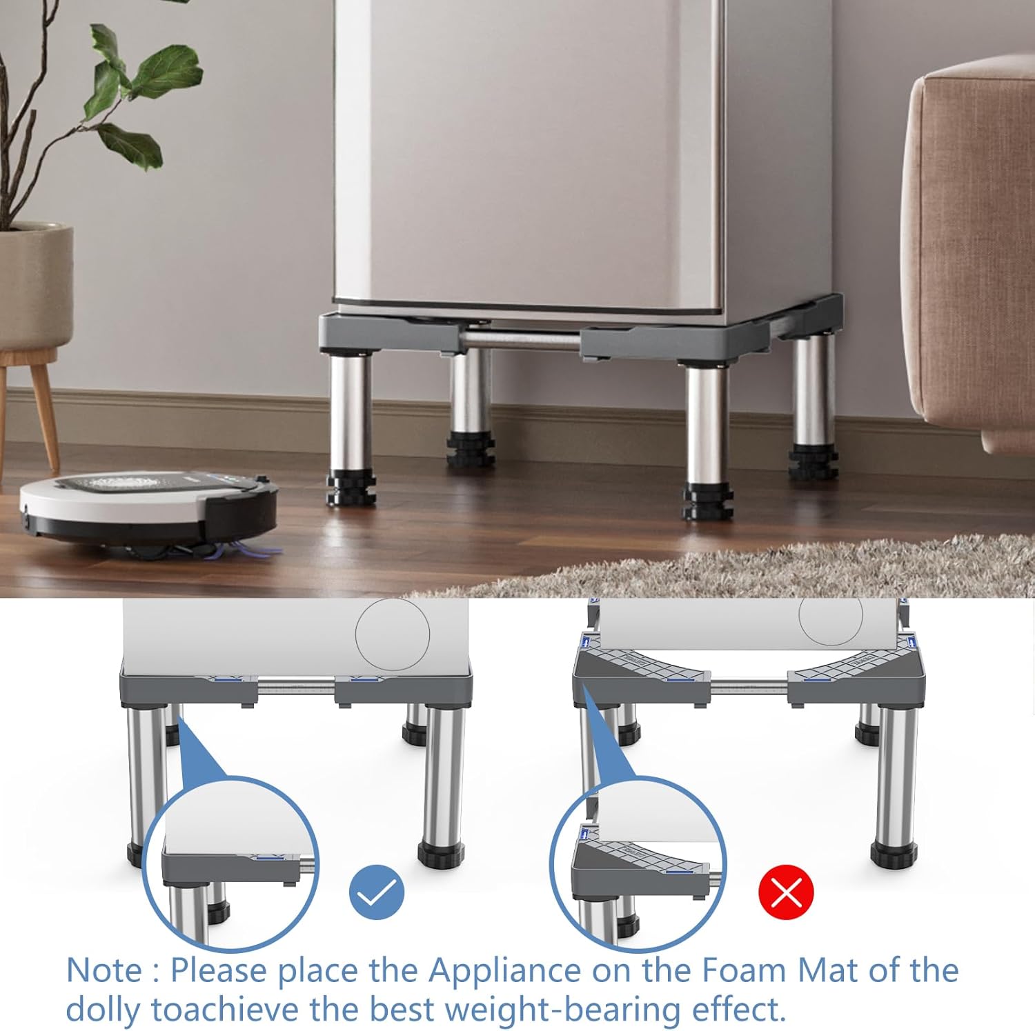 Примітка: База призначена лише для СТАТИЧНИХ пристроїв (наприклад, холодильників, морозильних камер, посудомийних машин, мобільних кондиціонерів). Він не підходить для пральних машин або інших пристроїв, які генерують сильну вібрацію або рух під час роботи, оскільки це може призвести до втрати стабільності.