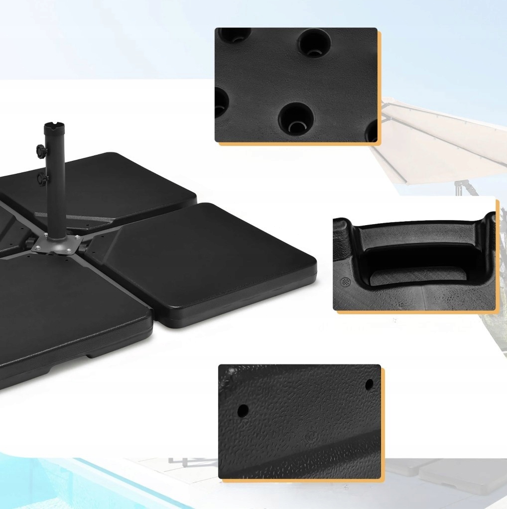 Стабільна опора вашої парасольки, що коливається, завдяки важкій основі парасольки! Виготовлена з високоякісного матеріалу HDPE, який є стійким до погодних умов і не легко деформується, наша квадратна основа для парасольки з 4 частин може використовуватися протягом тривалого часу. 4 окремі пластини можна швидко з’єднати, щоб підійти до основи парасольки з поперечною планкою (не входить у комплект). Завдяки бункеру, який легко наповнювати, можна заповнити велику кількість води та піску, щоб підвищити стабільність і стійкість до вітру. Але основа парасольки напрочуд легка перед заповненням водою. Крім того, він оснащений прихованою ручкою, що полегшує його перенесення. А 4 тарілки можна скласти одна на одну для зручного зберігання, коли вони не використовуються.