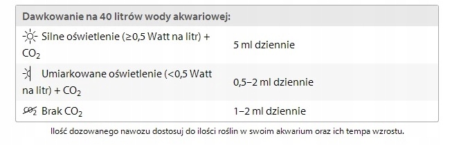 Ми рекомендуємо здійснити щотижневу зміну води на 25-50%. Кількість дозових добрив адаптується до кількості рослин у вашому акваріумі та їх темпах росту. Переконайтесь, що у резервуару оптимальну концентрацію вуглекислого газу 20-30 мг/л.