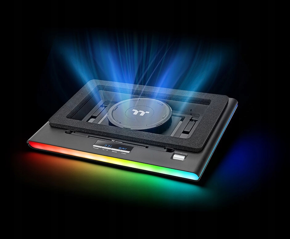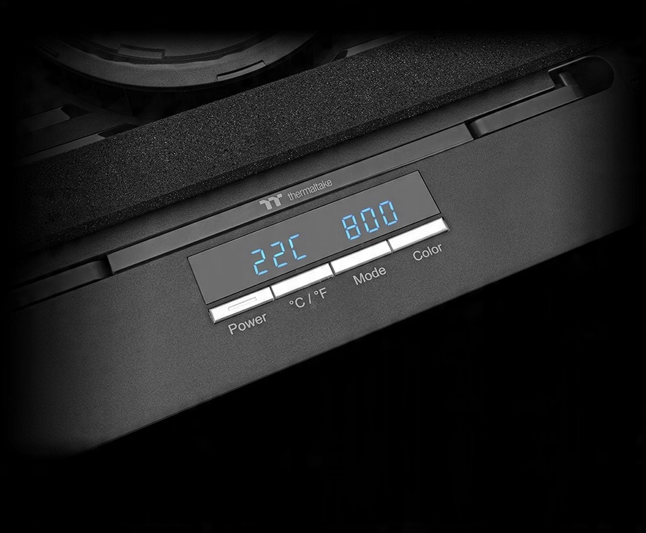 Цифрова панель відображає температуру від вбудованого датчика та поточної швидкості вентилятора. На панелі є 4 кнопки : живлення, ° C/° F, режим освітлення, колір освітлення. Читання відображається на цифровій панелі , що дозволяє легко відстежувати статус ноутбука та регулювати швидкість вентилятора холодильника ноутбука, якщо потрібно. / хв Використання колеса прокрутки . Просто прокрутіть, щоб збільшити швидкість або вниз, щоб зменшити її, забезпечуючи точний контроль.
