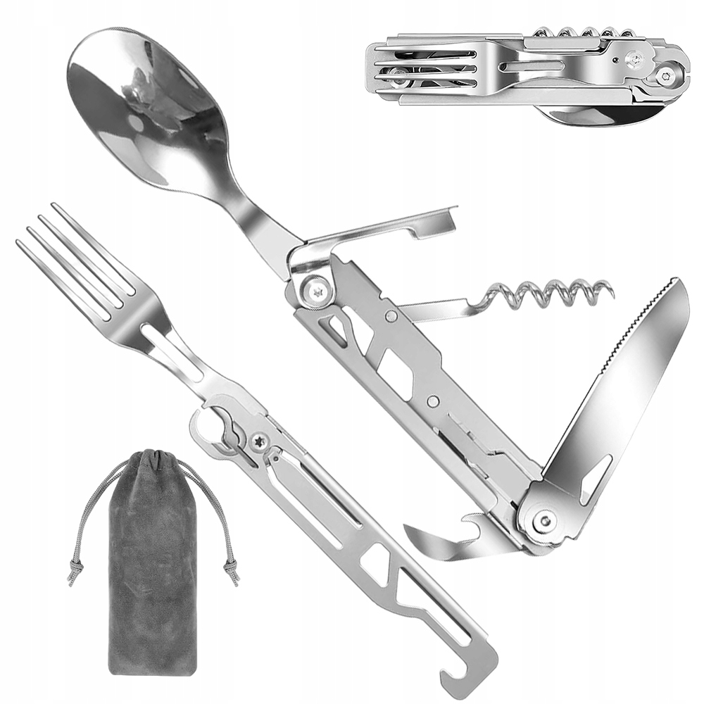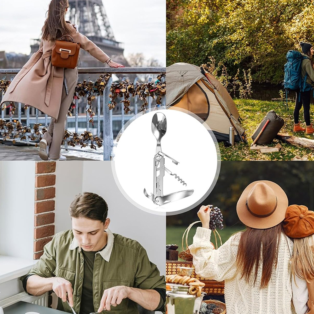 Включає нож, виделку, ложку, винний швафт та відкриття пляшок. Цей портативний, багатофункціональний кемпінг-столові прибори економить простір і простіше транспортувати.