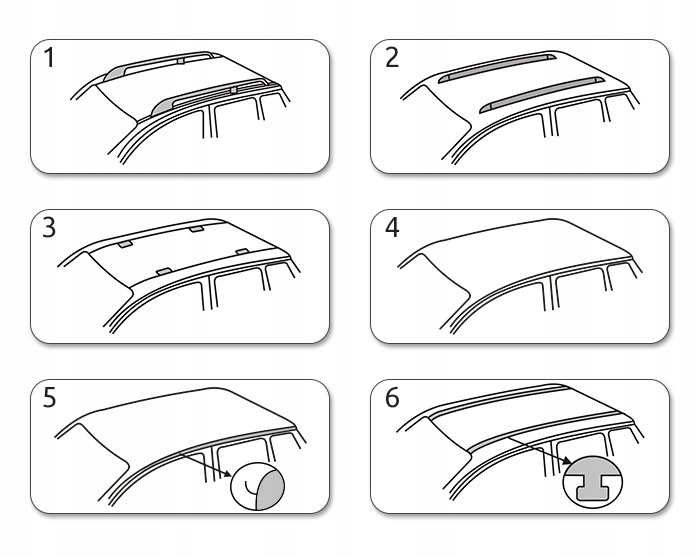 Існує 6 типових методів встановлення базових стовбурів залежно від типу автомобільного даху. Before buying, check what roof is in your car:
