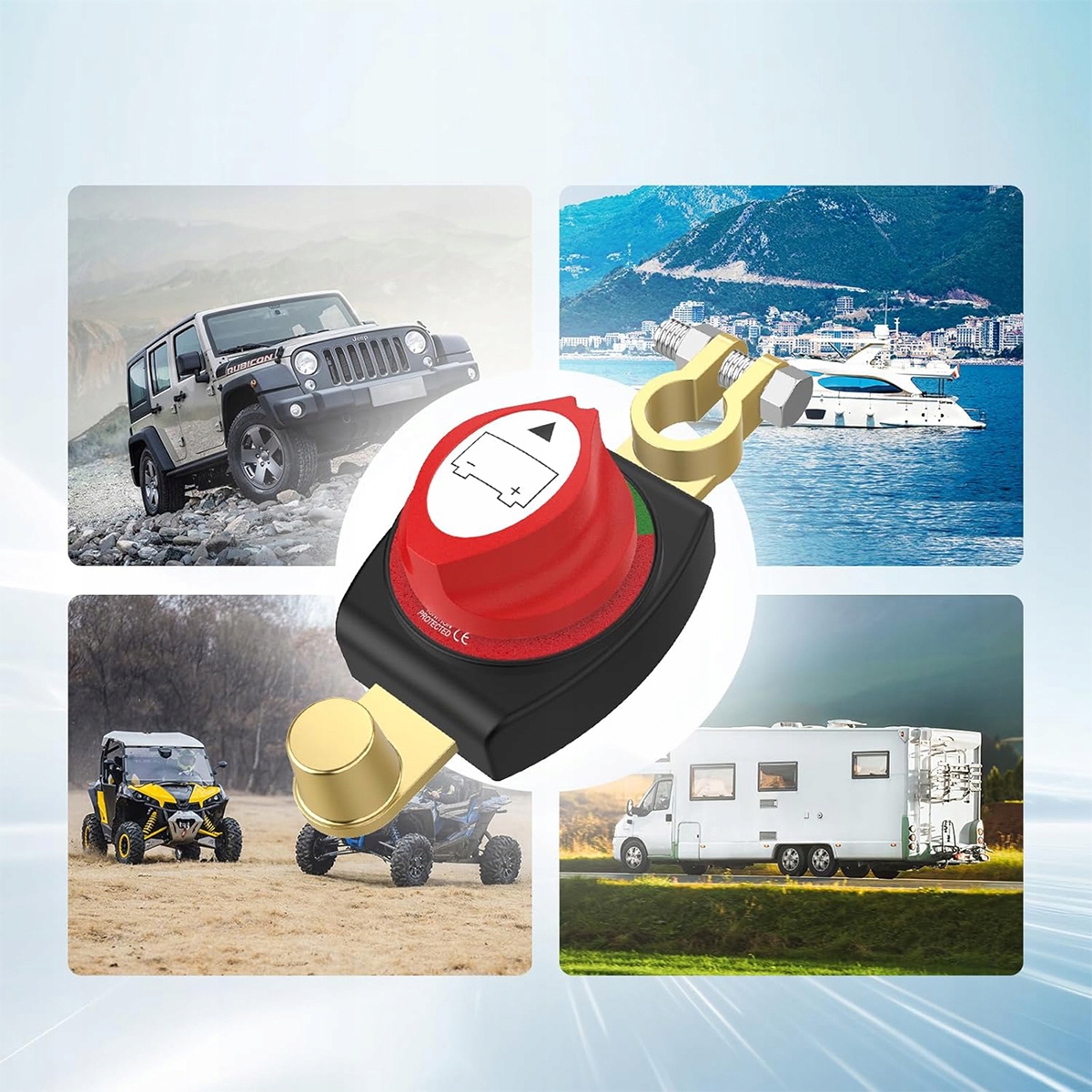 Основний перемикач акумулятора 12 В оснащений водонепроникною конструкцією, яка ефективно запобігає проникненню вологи. Основний перемикач акумуляторів особливо корисний для моря, в дощові дні або в інших вологих умовах, що пропонує більшу надійність.