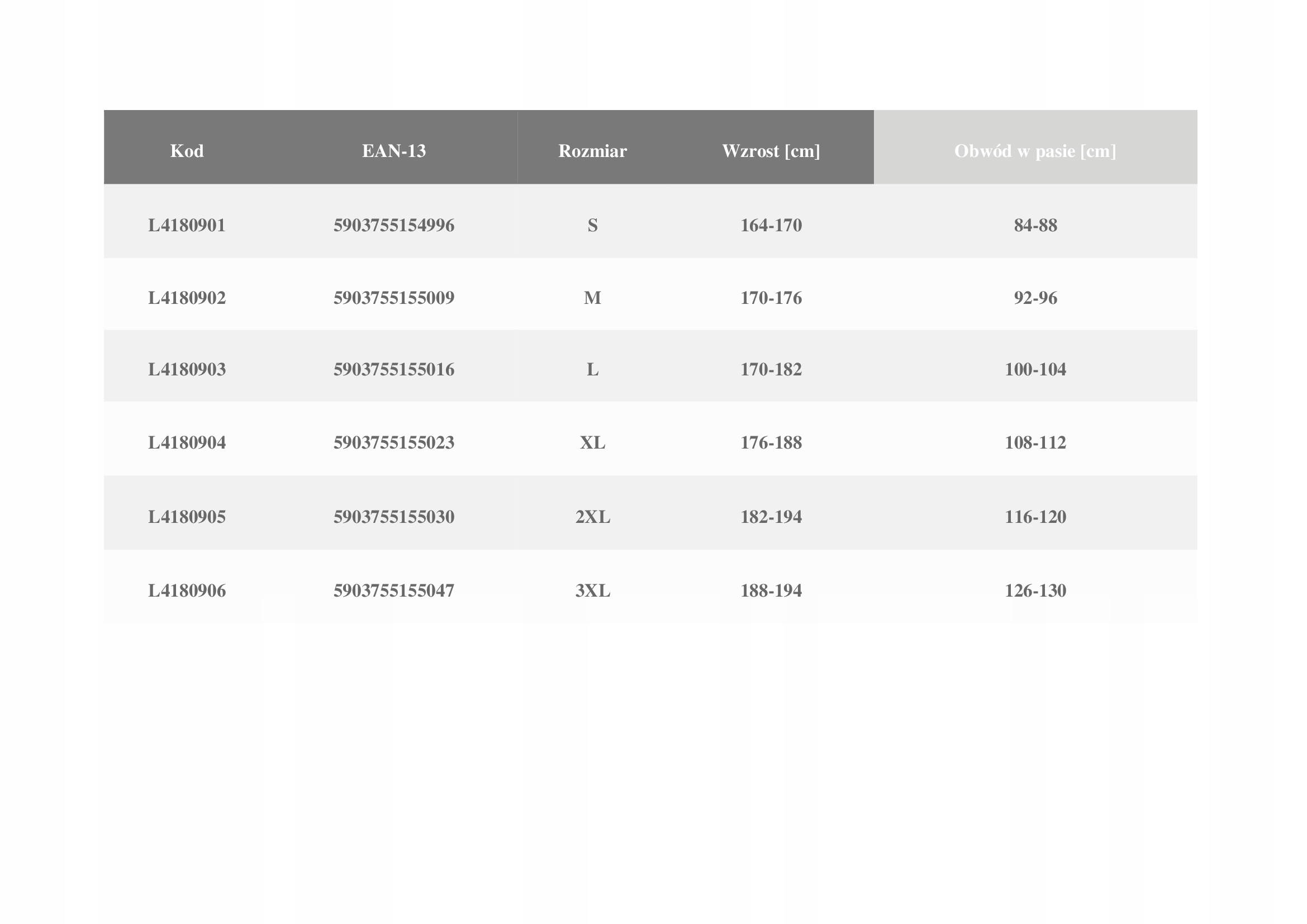 - EN ISO 13688 – міжнародний стандарт визначає загальні вимоги до продуктивності в області ергономіки, безпечності, маркування розміру, процесу старіння, сумісності та маркування захисного одягу, а також інформацію, яку виробник має надавати разом із продуктом. Цей міжнародний стандарт призначений для використання лише разом з іншими стандартами, що визначають вимоги до продуктивності, і не повинен використовуватися як окремий базовий документ). Нижче таблиця з розмірами для кращого підбору одягу.