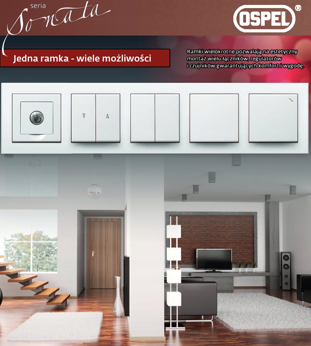 OSPEL SONATA - це високоякісне електромонтажне обладнання. Широкий асортимент вимикачів і всіх видів розеток здатний задовольнити найвишуканіші смаки. Незалежно від типу освітлення, використання обладнання OSPEL полегшує монтаж, підвищує безпеку та надає абсолютно нові можливості використання. Обладнання OSPEL адаптоване до рамної системи (1, 2, 3, 4 та 5-кратні рами). Серія Sonata призначена для вбудованого монтажу в стандартну коробку Ø60.
